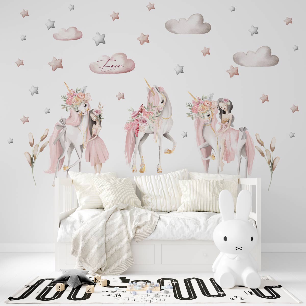 Creează un univers magic pentru fetița ta cu autocolantul textil de perete „Unicorn Fairies”! Designul captivant include prințese și unicorni, flori și steluțe. Perfect pentru decorarea camerei copiilor, acest sticker poate fi personalizat cu numele copilului sau un mesaj scurt, transformându-se într-o piesă de poveste.