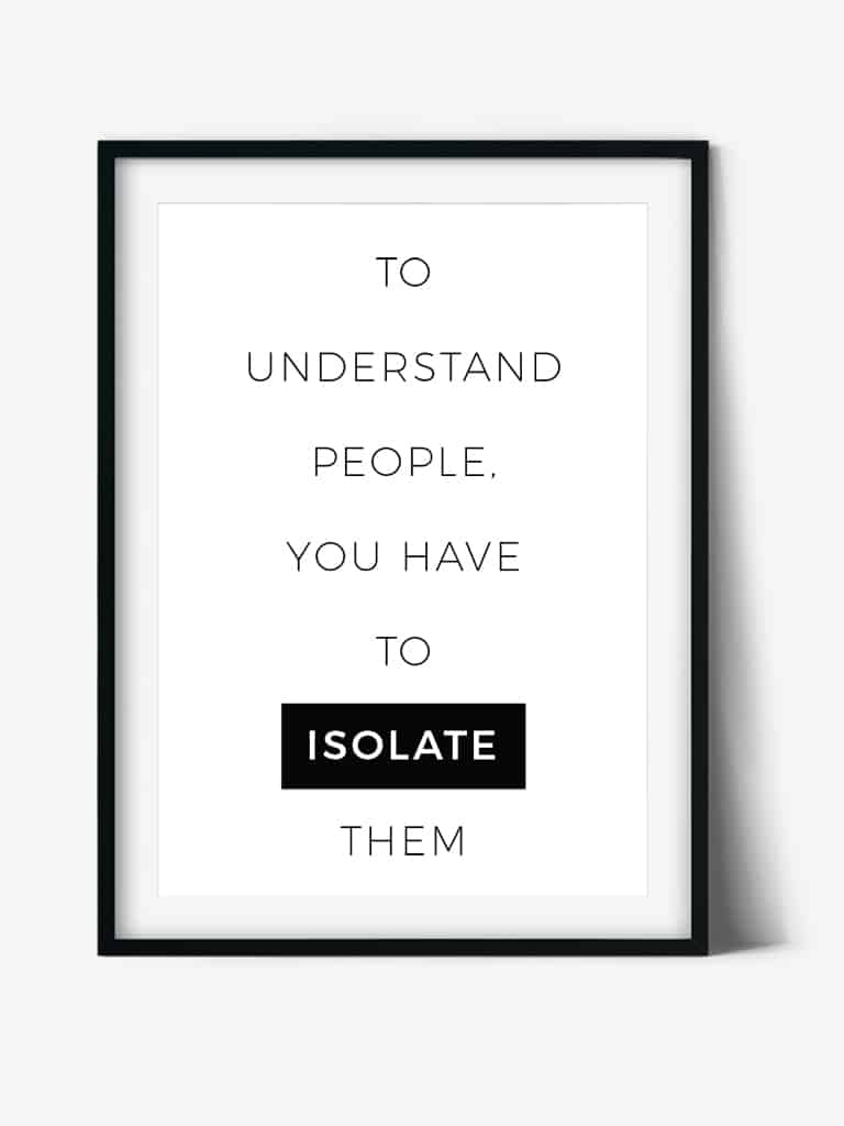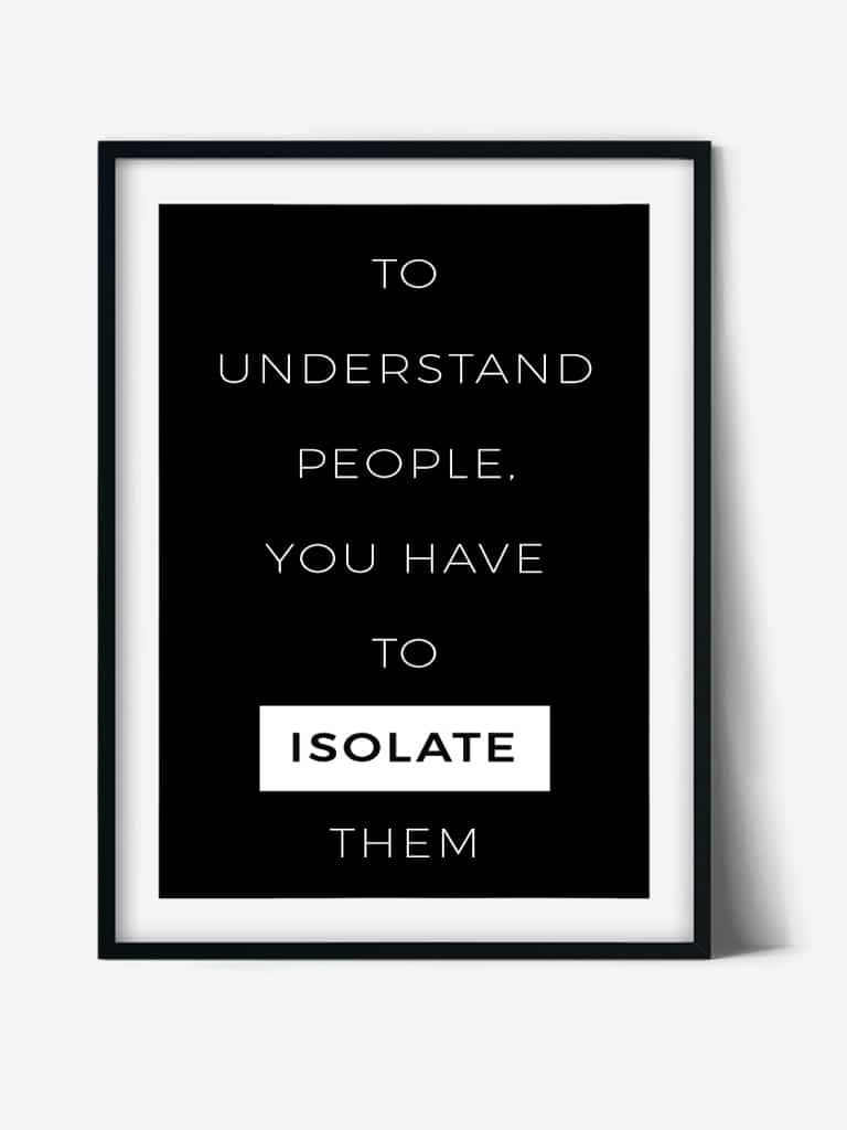 Alege tablourile cu mesaje emotionante | Tablou Art Text | To understand people, you have to isolate them. Tablouri inramate, printate pe hartie fine-art sau tablouri pe panza canvas, de oferit cadouri celor dragi. Posterele cu citate te vor ajuta sa gandesti intr-un mod pozitiv.