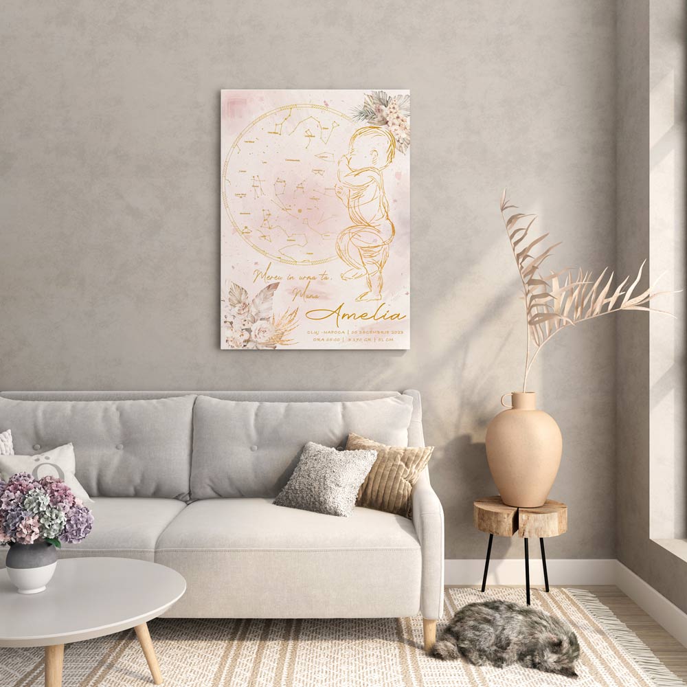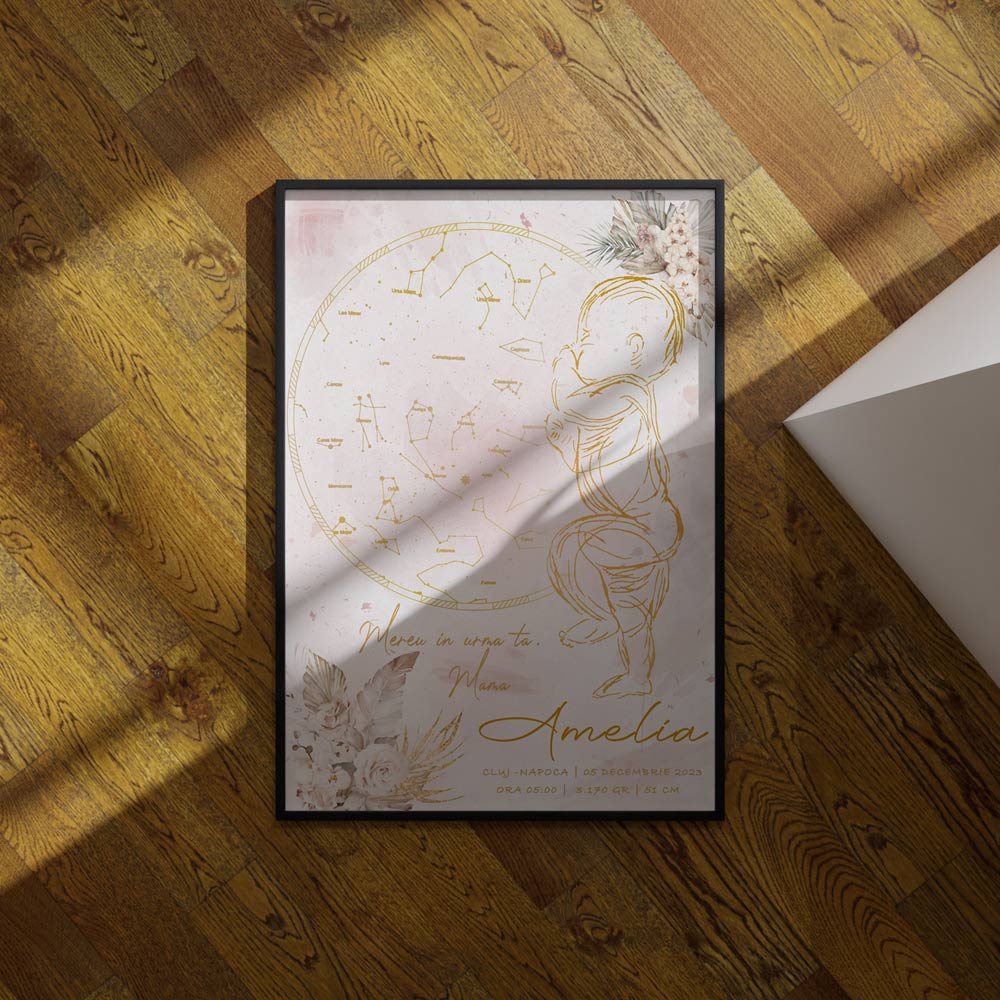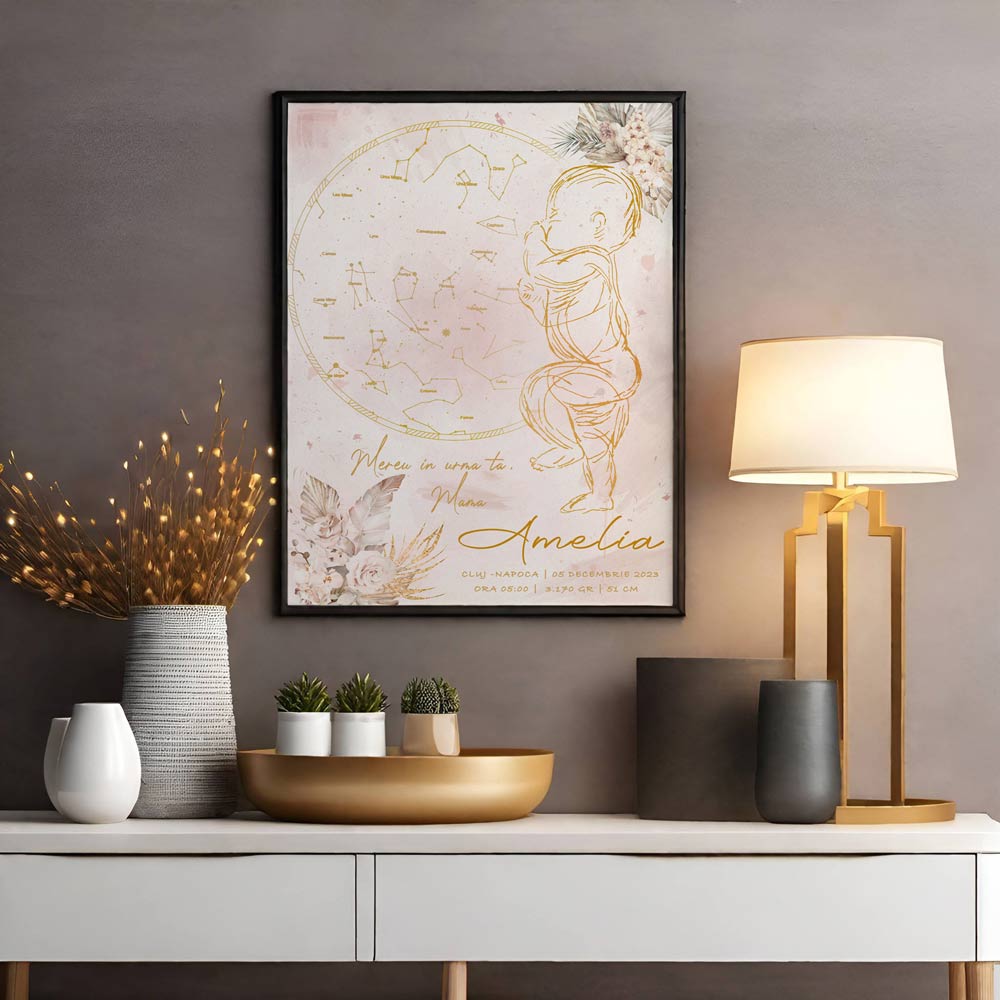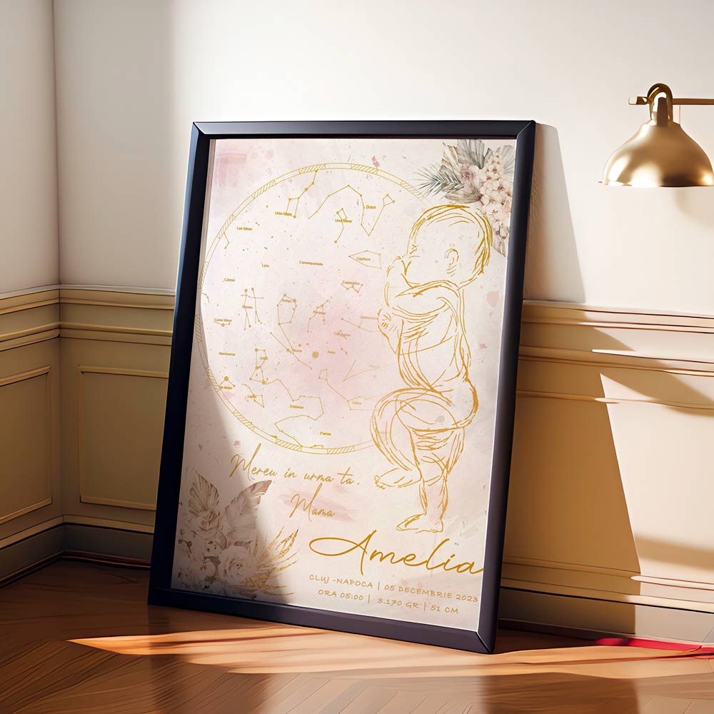 Un cadou cu adevărat unic și personal - Schita Bebelusului. Tablou Baby Birth 1:1 | Tabloul copilului tau in marime naturala si pozitia stelelor | Roz Auriu