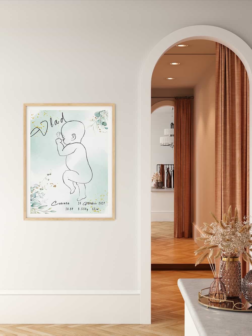 Bebelusul tau este o minune iar minunea nasterii sale este transpusa in tabloul Baby Birth | Eucalyptus Leaves pentru a pastra emotiile primei imbratisari vii de-a lungul timpului. Tabloul este unicat, fiind personalizat cu dimensiunea exacta a lungimii sale din ziua nasterii. Este de asemenea personalizat cu numele sau, al localitatii, cu data si ora nasterii.