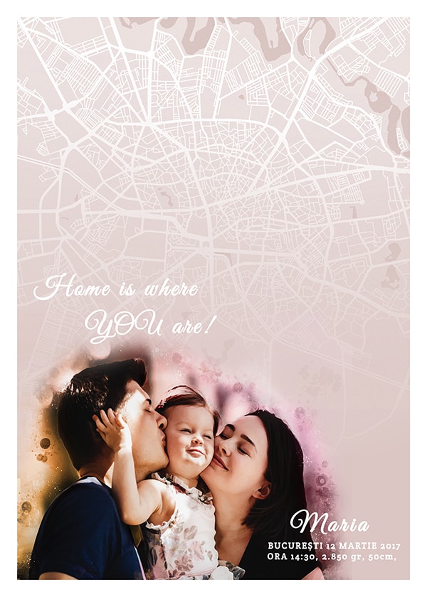 Lumea este umitoare. Poti aduce acum locurile dragi cu tine acasa sau la birou: localitatea copilariei tale sau orasul unde s-a nascut copilul tau, un oras de care sau in care te-ai indragostit sau pur si simplu orasul in care locuiesti. Poti personaliza tabloul cu o fotografie draga pe care designerii nostri o vor prelucra in stil watercolor (acuarela).