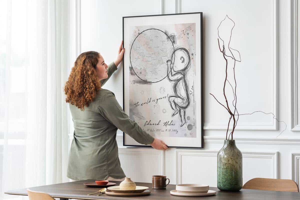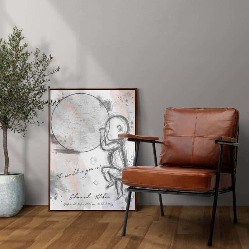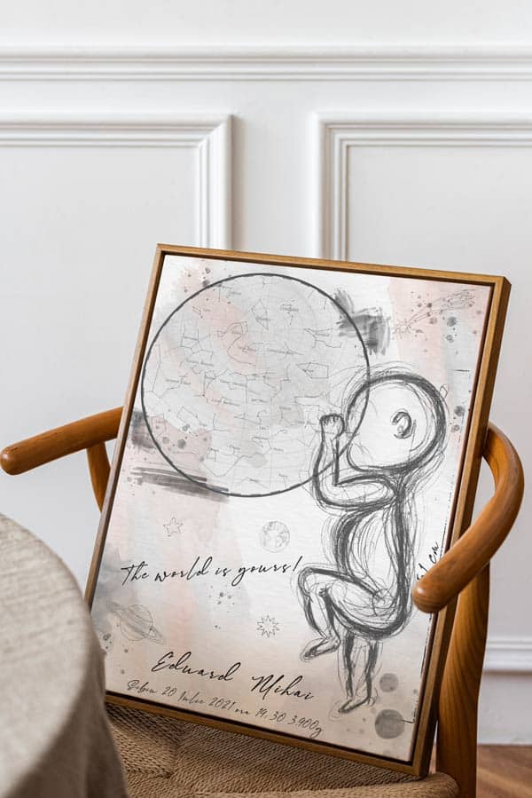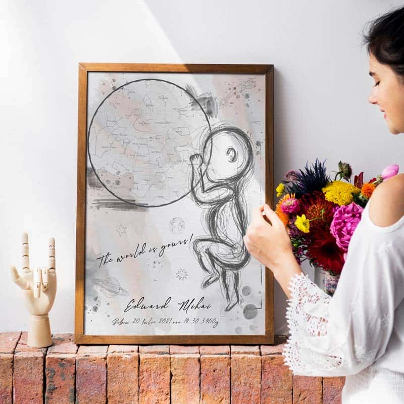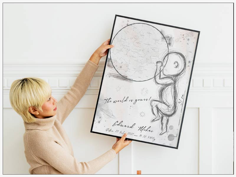 Bebelusul tau este o minune iar minunea nasterii sale este transpusa in tabloul Baby Birth Poster | Sketch Art pentru a pastra emotiile primei imbratisari vii de-a lungul timpului. Tabloul este unicat, fiind personalizat cu dimensiunea exacta a lungimii sale din ziua nasterii. Este de asemenea personalizat cu numele sau, al localitatii si cu harta cu pozitia stelelor din momentul nasterii sale.