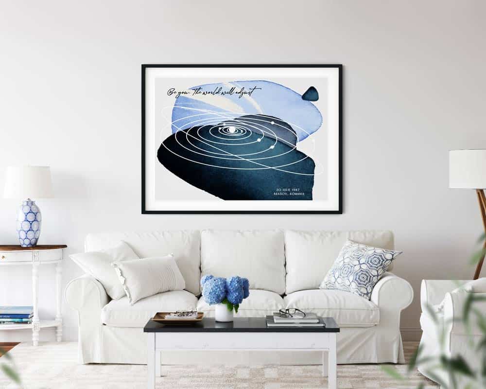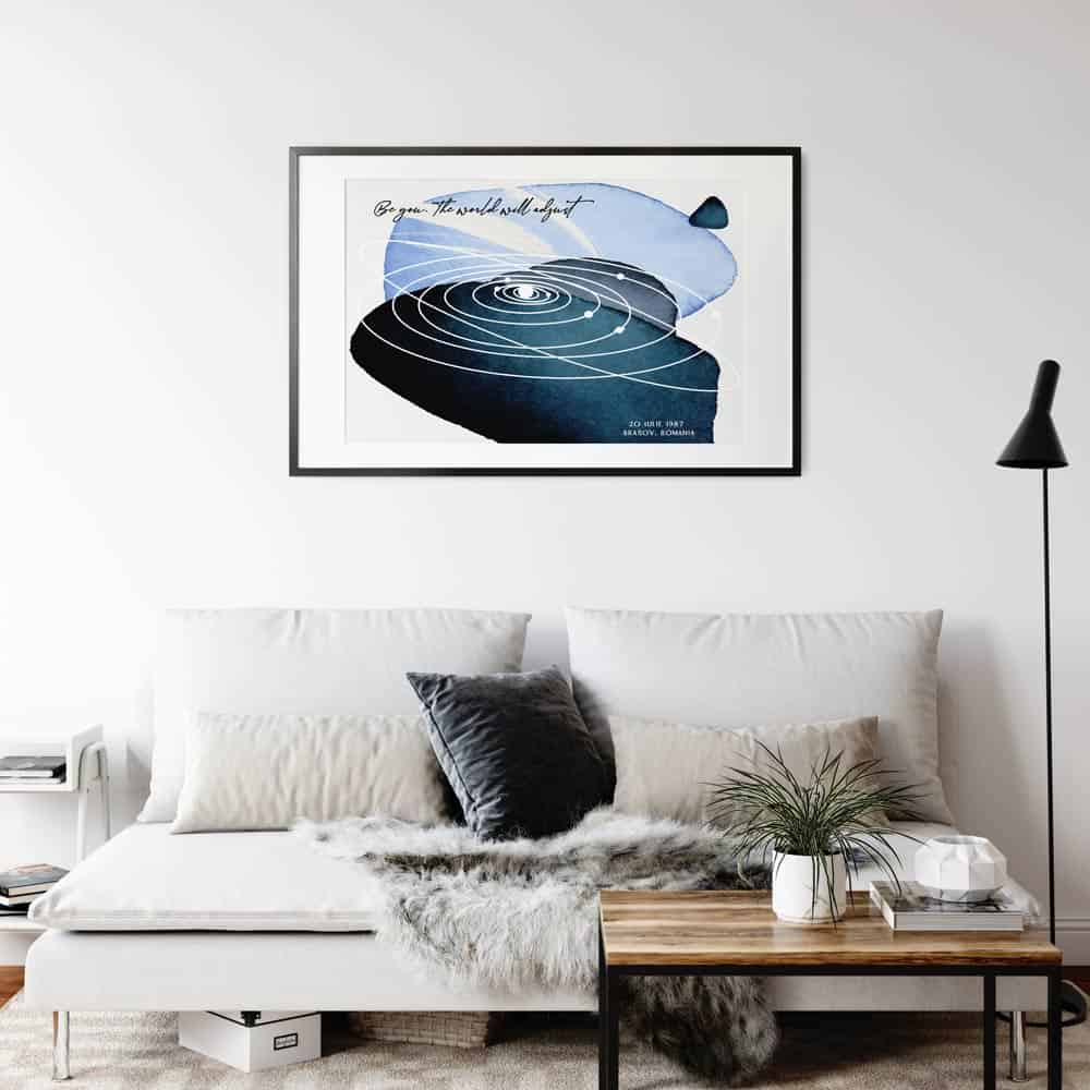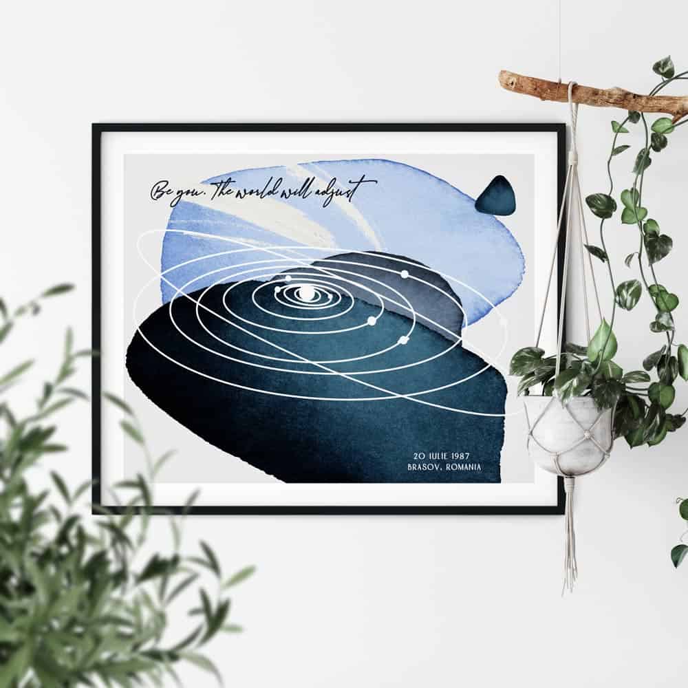 Un cadou cu adevărat unic și personal. Harta alinierii planetelor din sistemul solar așa cum a arătat într-un anumit moment special în timp. | Abstract Planets - Blue. Vă mai aduceți aminte acel moment, în care ați simțit că lumea stă în loc? Cu siguranță fiecare dintre noi retrăiește acele clipe citind aceste rânduri. Tabloul combină exactitatea astrofizicii cu eleganța și unicitatea artei. Orbitele planetelor sunt conturate pe un fundal abstract, in nuante de albastru.