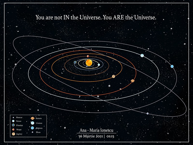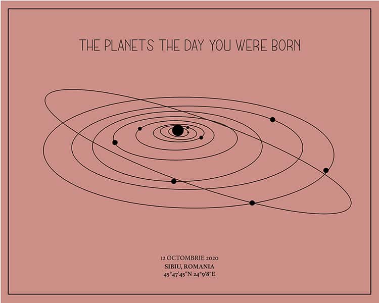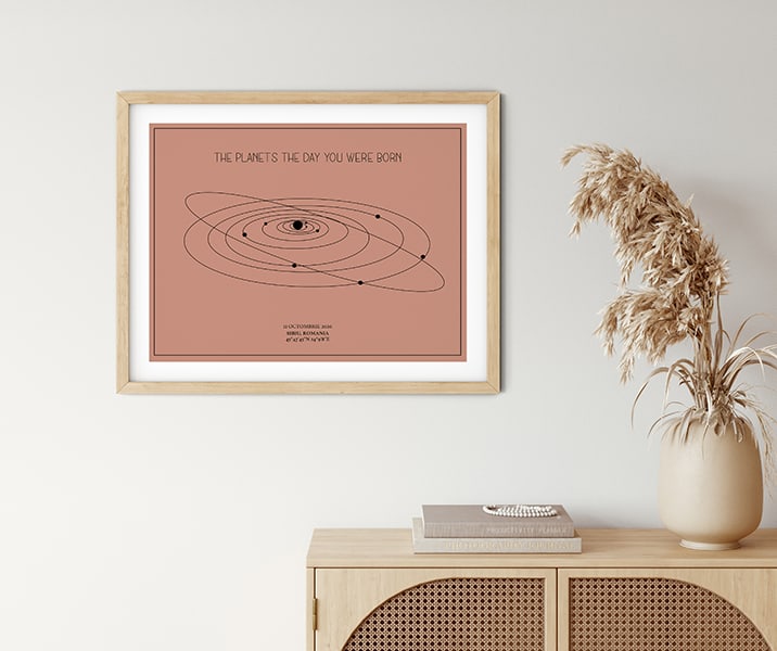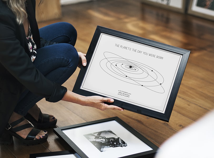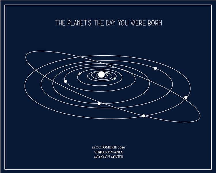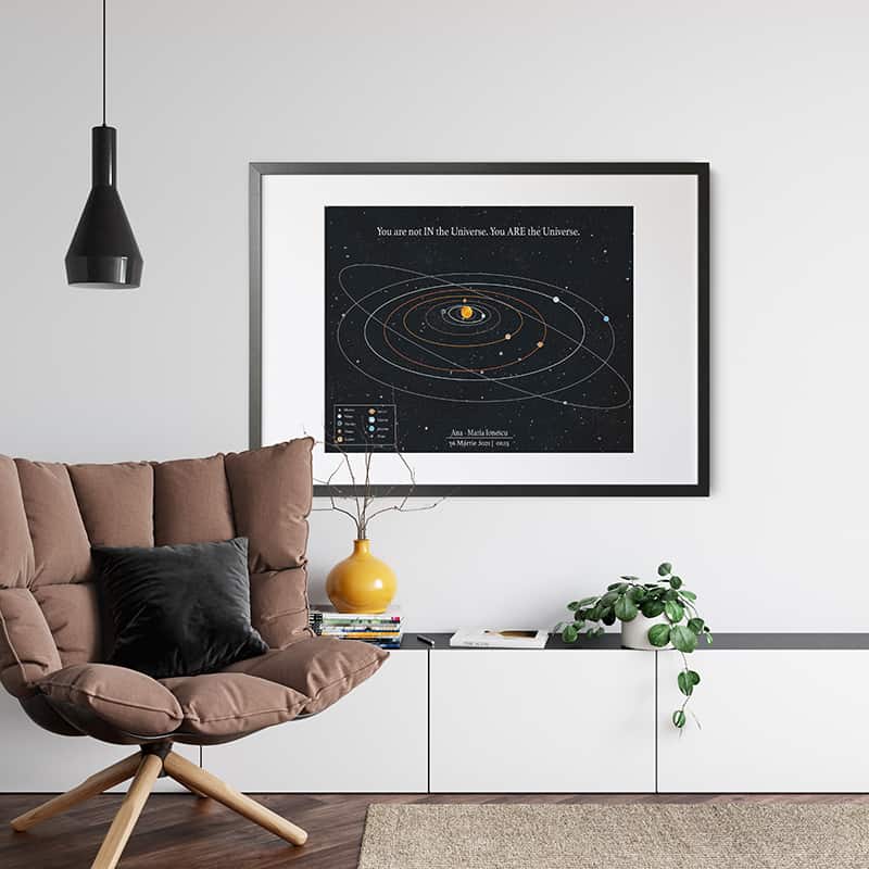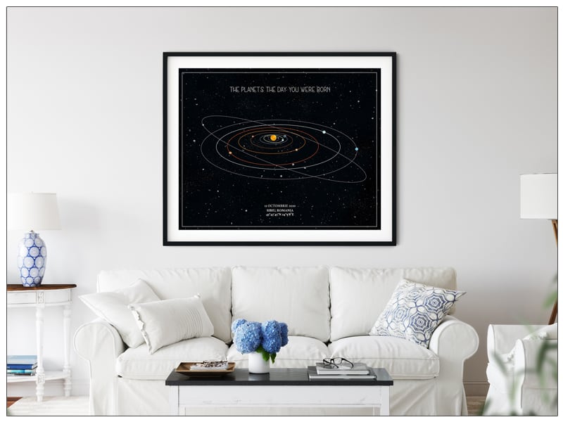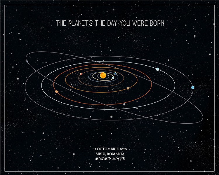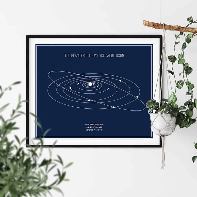 Un cadou cu adevărat unic și personal. Harta alinierii planetelor din sistemul solar așa cum a arătat într-un anumit moment special în timp. Vă mai aduceți aminte acel moment, în care ați simțit că lumea stă în loc? Cu siguranță fiecare dintre noi retrăiește acele clipe citind aceste rânduri. Tabloul combină exactitatea astrofizicii cu eleganța și unicitatea artei.