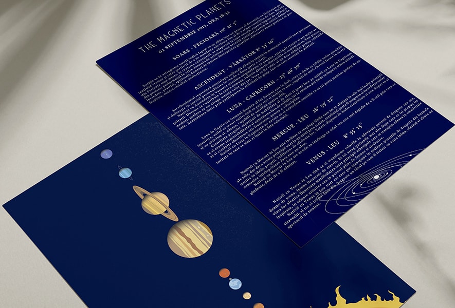 Poti opta, aditional, sa le oferi celor dragi si un card cu interpretarea astrologica a datei evenimentului. ( Zodie, Ascendent, Luna, Mercur si Venus).