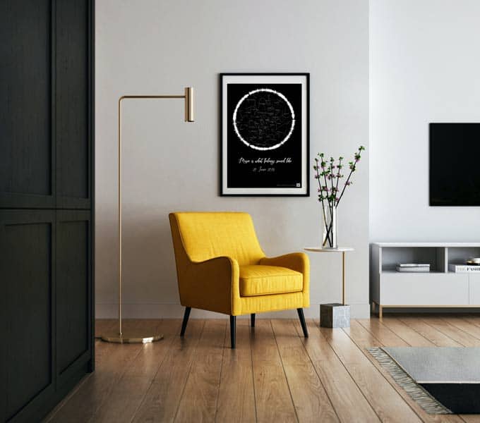 Un cadou cu adevărat unic și personal. Harta pozitiei stelelor așa cum a arătat într-un anumit moment special în timp. Vă mai aduceți aminte acel moment, în care ați simțit că lumea stă în loc? Cu siguranță fiecare dintre noi retrăiește acele clipe citind aceste rânduri. Tabloul combină exactitatea astrofizicii cu eleganța și unicitatea artei.