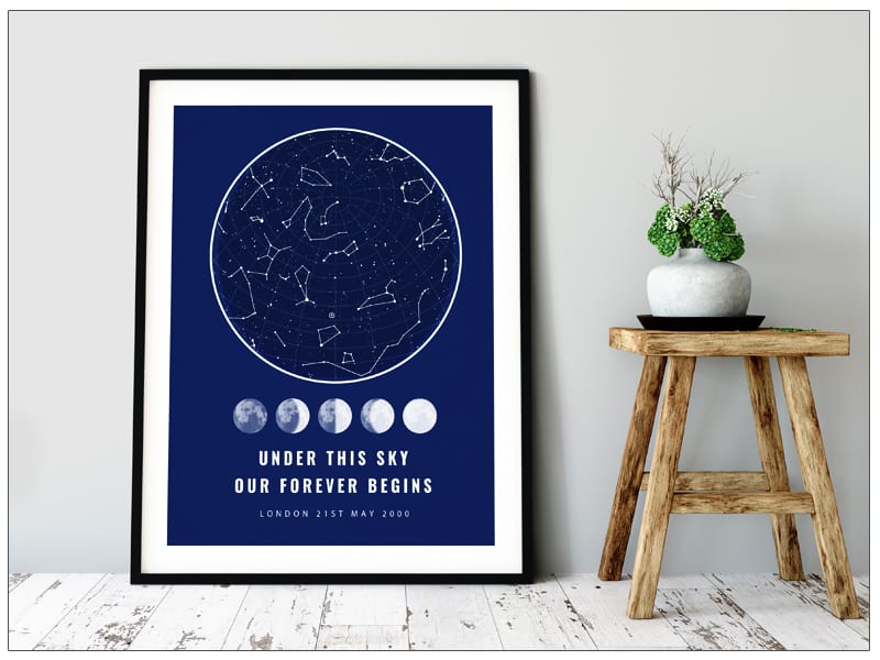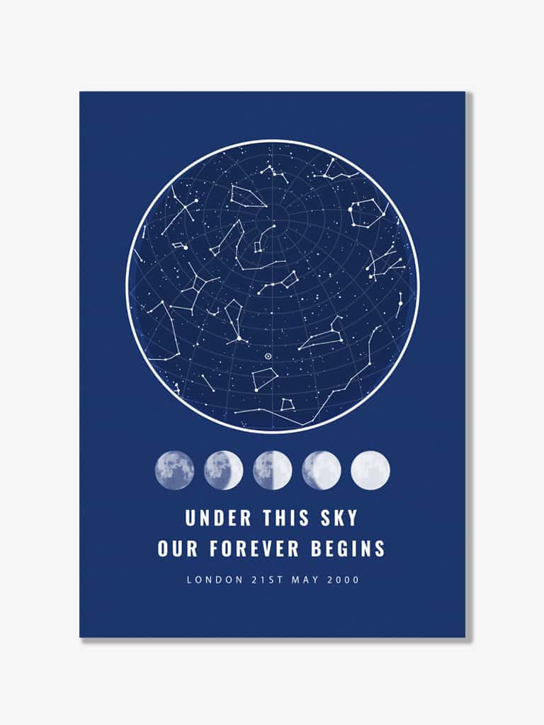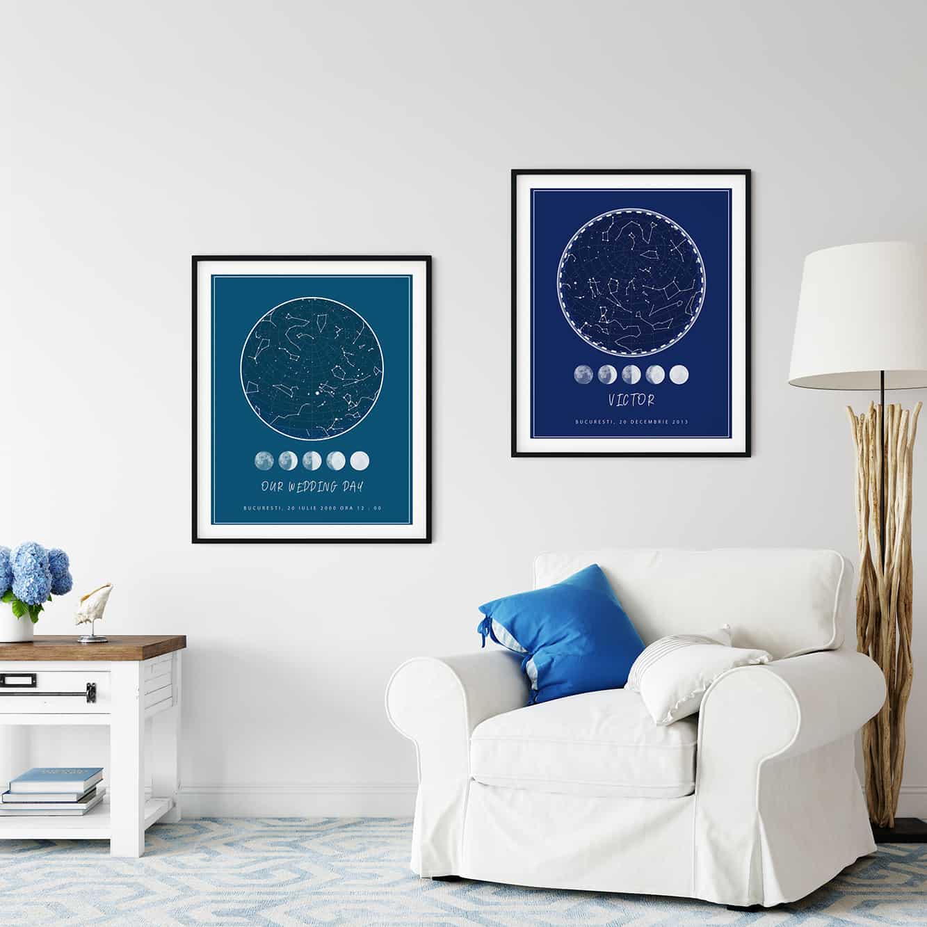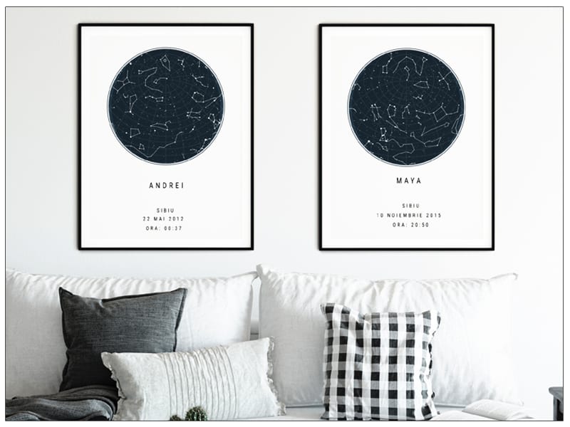 Tabloul este un mod minunat de a vă aminti dvs sau cuiva drag de momentele speciale ale vieții. Vă puteți crea o hartă a cerului foarte precisă. Oamenii de știintă au calculat cu exactitate ce stele sunt vizibile din orice loc de pe Pământ la orice data și oră (din trecut sau din viitor) iar cu aceste date vă vom crea harta dvs unică. Stele cuprinse pe harta sunt cele cu magnitudinea (strălucirea) mai mare de 6. Scara cuprinde șase „mărimi”: stelele cele mai strălucitoare sunt de primă mărime, iar stelele mai puțin strălucitoare încă vizibile cu ochiul liber sunt de a șasea mărime. Harta se poate personaliza cu un mesaj pe care doriți să il transmiteți persoanei speciale din viața dvs.