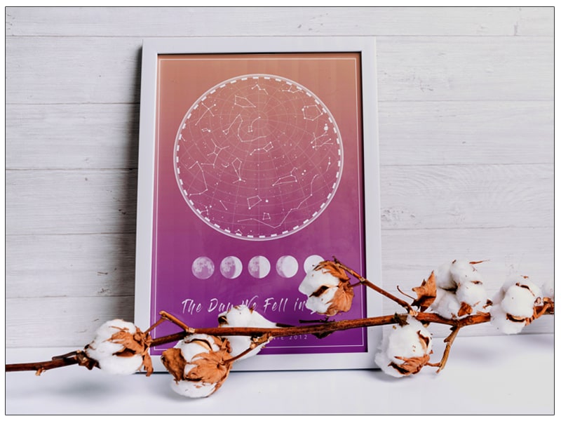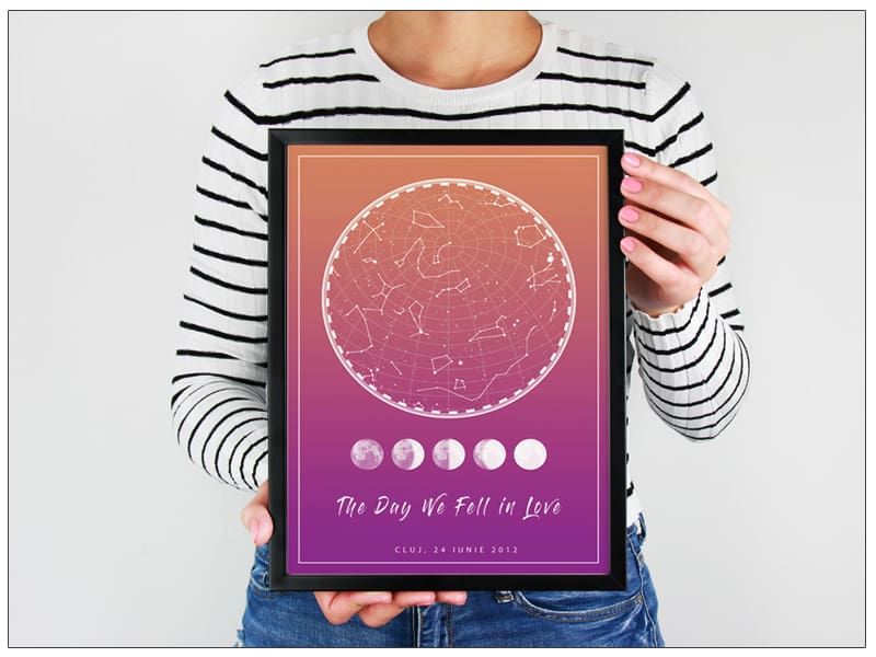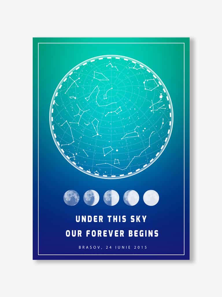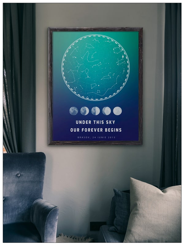 Tabloul este un mod minunat de a vă aminti dvs sau cuiva drag de momentele speciale ale vieții. Vă puteți crea o harta a cerului foarte precisă. Oamenii de știintă au calculat cu exactitate ce stele sunt vizibile din orice loc de pe Pământ la orice data și oră (din trecut sau din viitor) iar cu aceste date vă vom crea harta dvs unică. Stele cuprinse pe harta sunt cele cu magnitudinea (strălucirea) mai mare de 6. Scara cuprinde șase „mărimi”: stelele cele mai strălucitoare sunt de primă mărime, iar stelele mai puțin strălucitoare încă vizibile cu ochiul liber sunt de a șasea mărime. Harta se poate personaliza cu un mesaj pe care doriți să il transmiteți persoanei speciale din viața dvs.