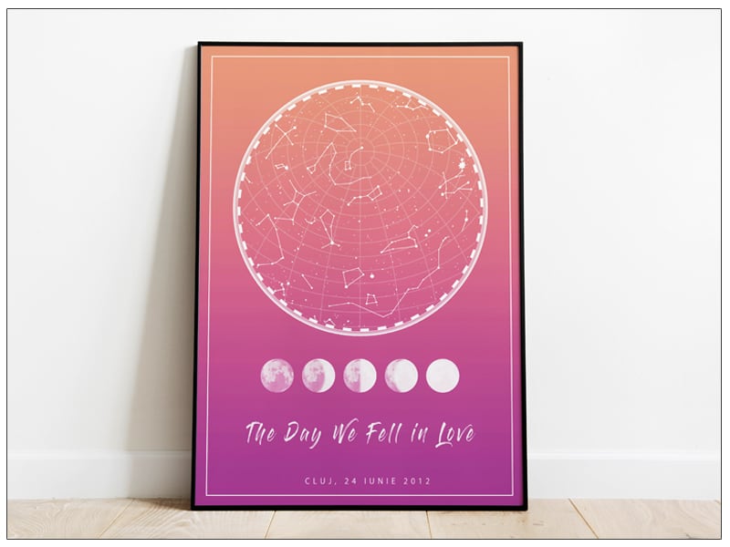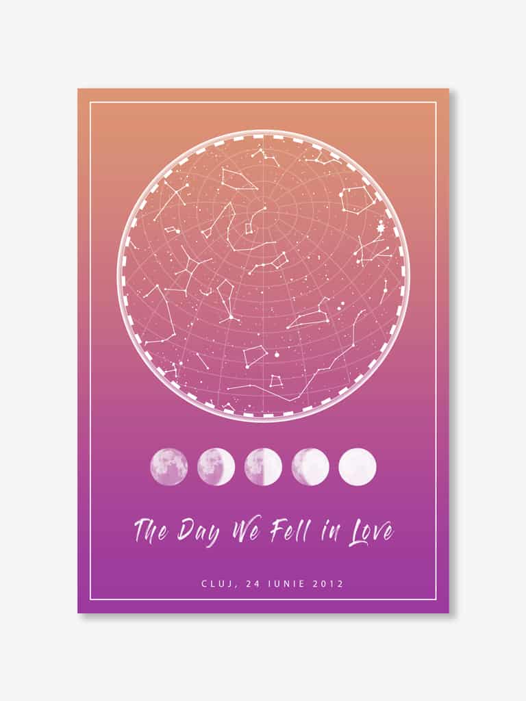 Un cadou cu adevărat unic și personal. Harta stelelor în stil degrade așa cum a arătat într-un anumit moment special în timp. Vă mai aduceți aminte acel moment, în care ați simțit că lumea stă în loc? Cu siguranță fiecare dintre noi retrăiește acele clipe citind aceste rânduri. Tabloul combină exactitatea astrofizicii cu eleganța și unicitatea artei.
