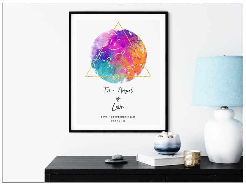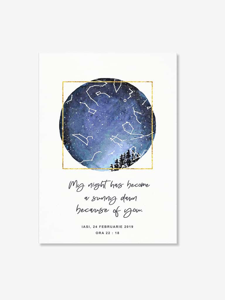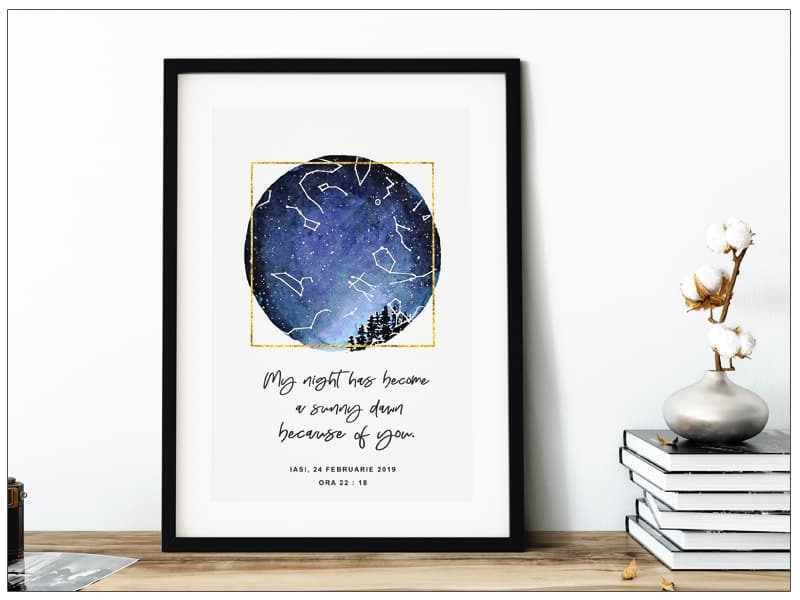 Tabloul este un mod minunat de a va aminti dvs sau cuiva drag momentele dragi ale vietii. Va puteti crea o harta a cerului foarta precisa. Oamenii de stiinta au calculat cu exactitate ce stele sunt vizibile din orice loc de pe Pamant la orice data si ora (din trecut sau din viitor) iar cu aceste date va vom crea harta dvs unica.