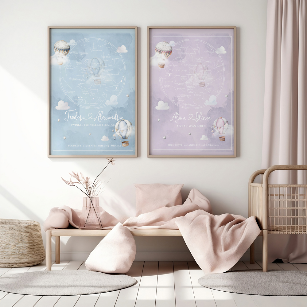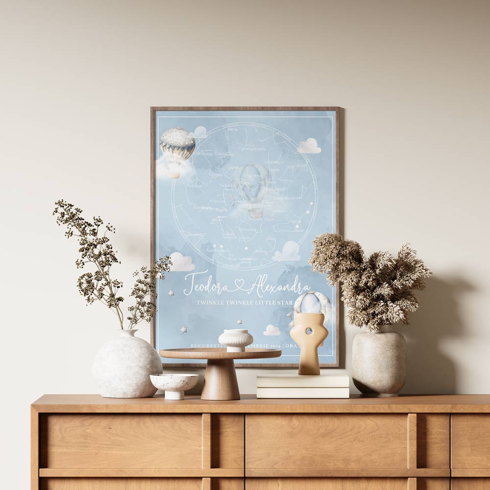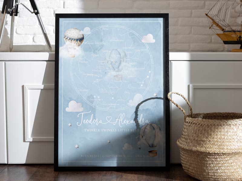 Un cadou cu adevărat unic și personal pentru cei mici. Tablou cu harta poziției a stelelor pentru camera copiilor | BLUE BALLOONS.