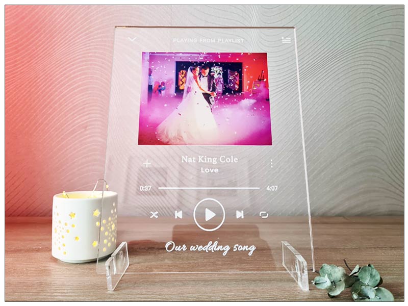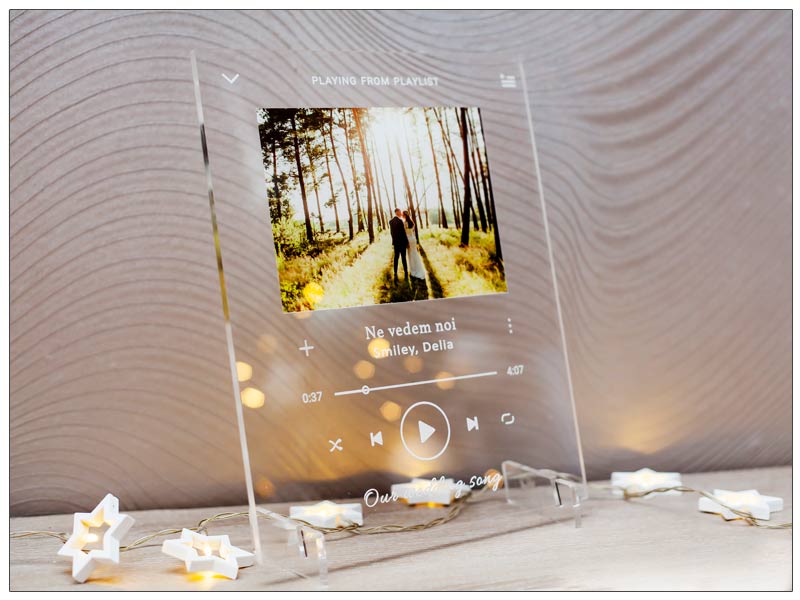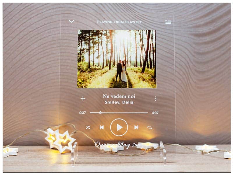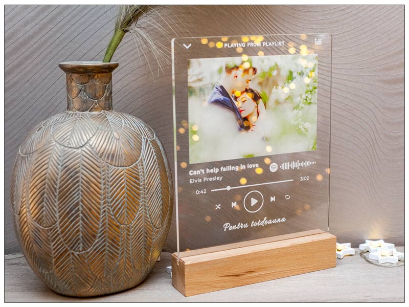 Alege o fotografie dragă și o melodie preferată și transformă-le într-un cadou unic și personal pe care il poți oferi celor dragi cu orice ocazie: de Crăciun, de Sfântul Valentin, de Paște sau de onomastici. Tabloul personalizat pe sticla acrilică | Placheta Fotografie & Melodie preferata poate fi un cadou minunat pentru bunici, parinți sau colegi.