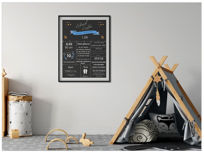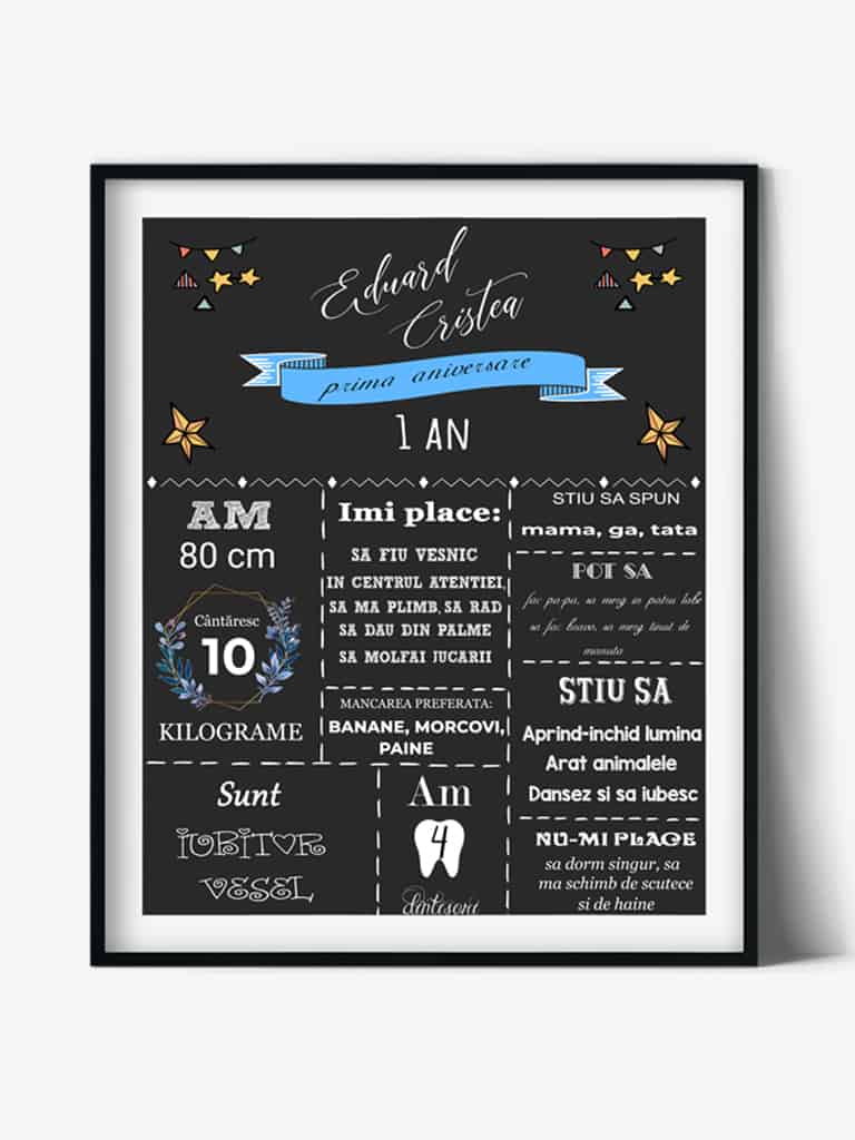 Cu totii avem adunate milioane de amintiri, iar primul an din viata copiiilor nostri este incarcat de momente unice: primul zambet, primul dintisor, primul pas. Tabloul personalizat, "Prima mea aniversare", este un infografic care surprinde toate evenimentele speciale care s-au desfasurat in primul an de viata al copiiilor nostri. Tabloul se personalizeaza cu datele fiecarui copil si cu fotografiile preferate.
