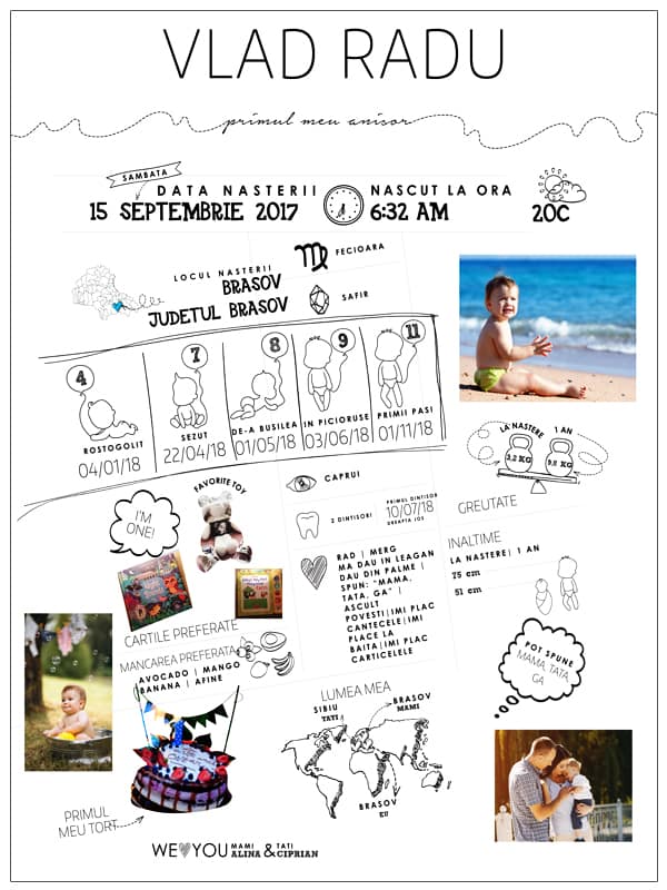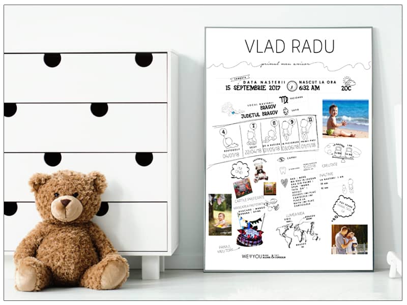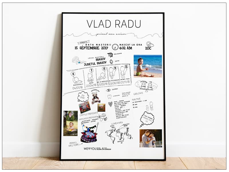 Cu toţii avem adunate milioane de amintiri, iar primul an din viaţa copiiilor nostri este încărcat de momente unice: primul zâmbet, primul dinţisor, primul pas. Tabloul personalizat, "Primul meu anişor", este un infografic care surprinde toate evenimentele speciale care s-au desfăşurat în primul an de viaţă al copiiilor nostri. Tabloul se personalizează cu datele fiecărui copil şi cu fotografiile preferate.