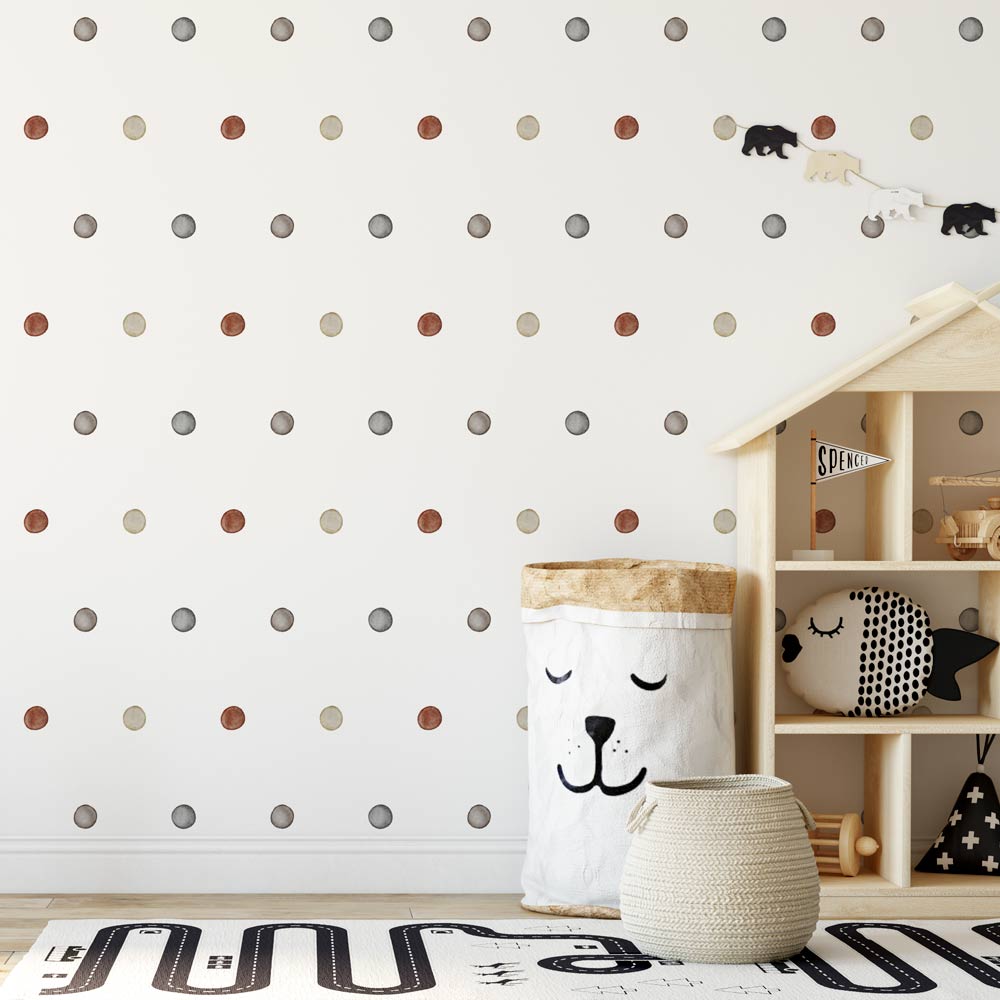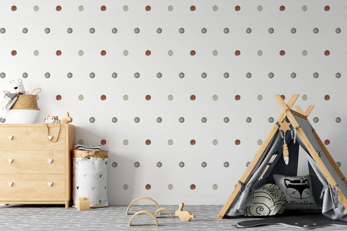 Tapetul Boho Dots din Colecția Abstract - Kids este realizat in culori pământii, neutre (stil Boho), cu o textură de acuarelă ("pictată"), ușor de asortat cu mobilierele de tip Montessori pentru camera copiilor. Tapetul se poate personaliza pe dimensiunile camerei tale.