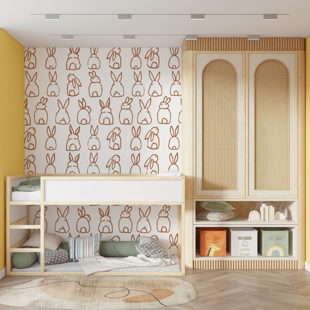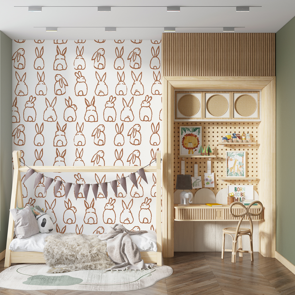 Transformă camera copilului într-un spațiu plin de căldură și tandrețe cu Bunny Bun White, un tapet premium cu design jucăuș și minimalist.