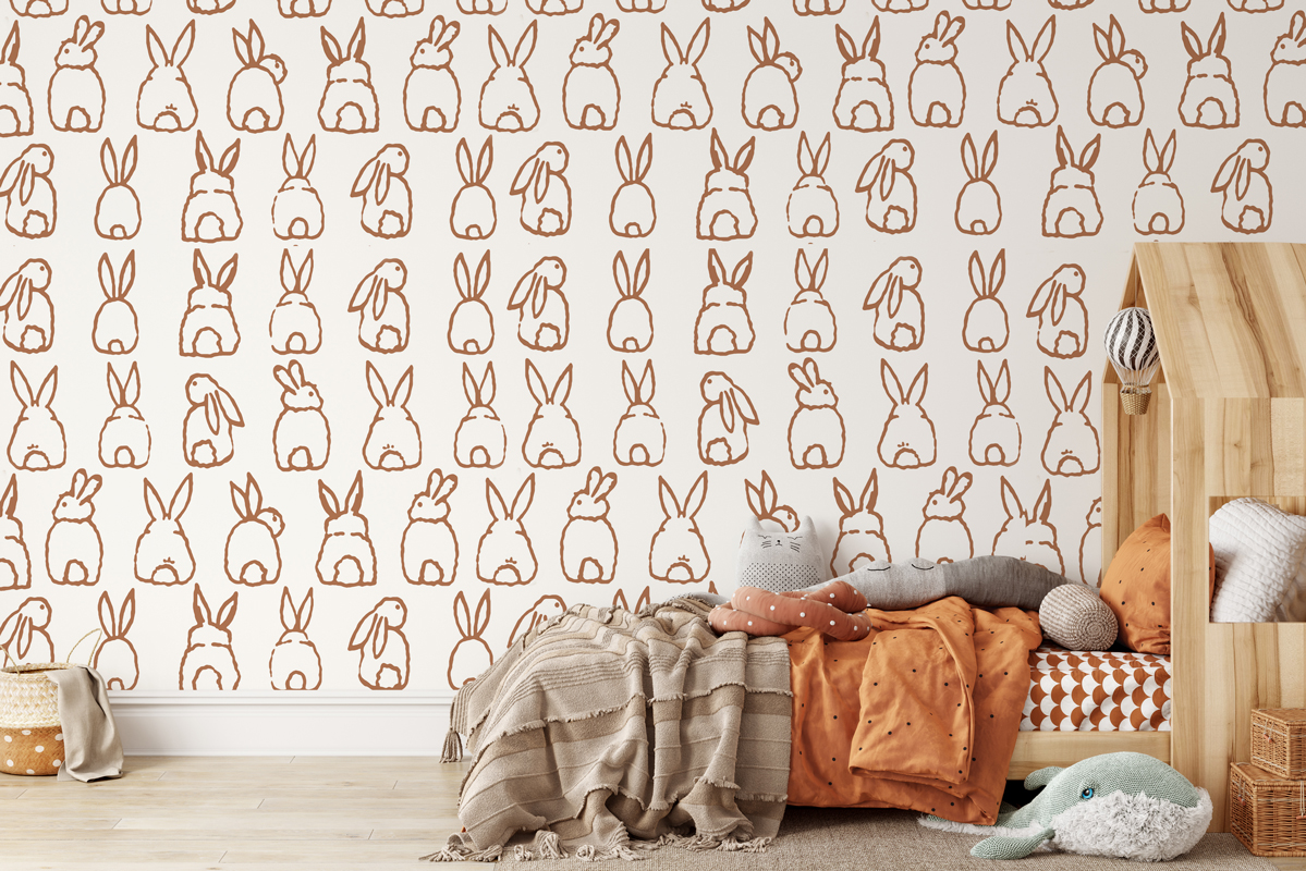 Siluetele de iepurași in culori calde caramel - teracota sunt schițate delicat pe un fundal alb – o combinație perfectă pentru interioare cozy, naturale și luminoase.