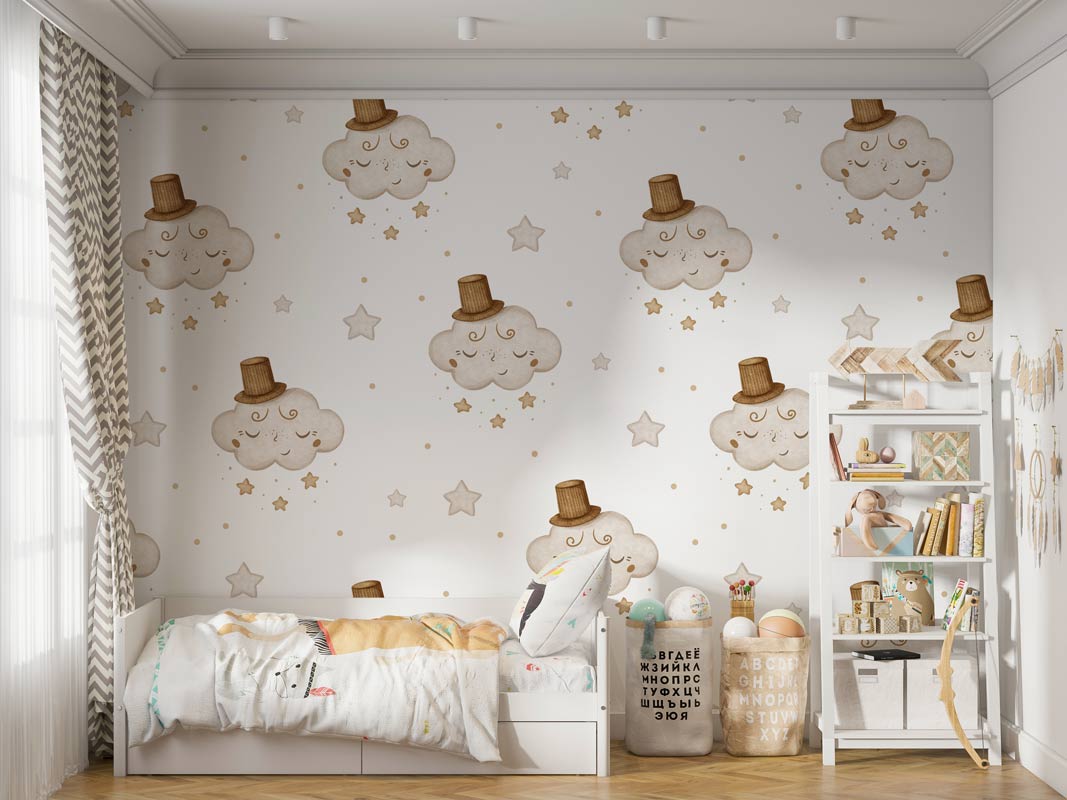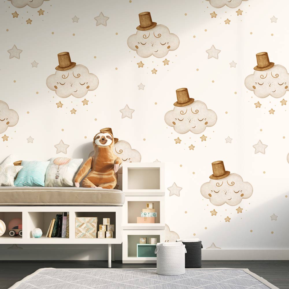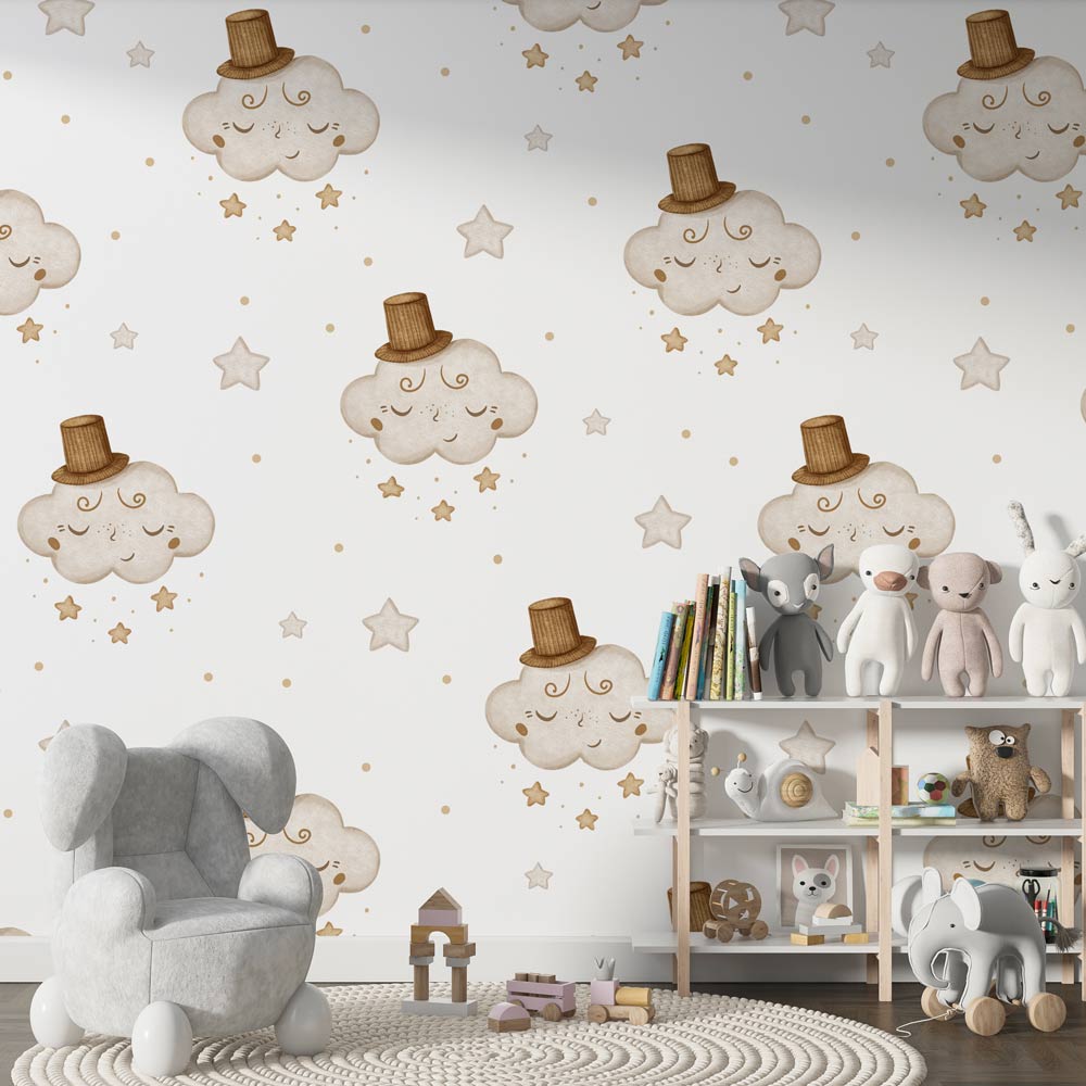 Magic Clouds - Tapet premium pentru copii cu norisori somnoroși în culori neutre și pământii (bej, crem, maroniu), ideal pentru un decor relaxant și natural. Perfect pentru a aduce un strop de eleganță și calm în spațiul celor mici. Pentru bebeluși, fetițe sau băieți. Ușor de Aplicat. Decor inedit. Rezistente la umezeală. Culori Vibrante.