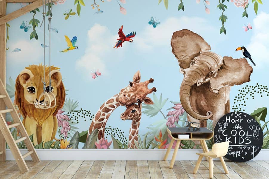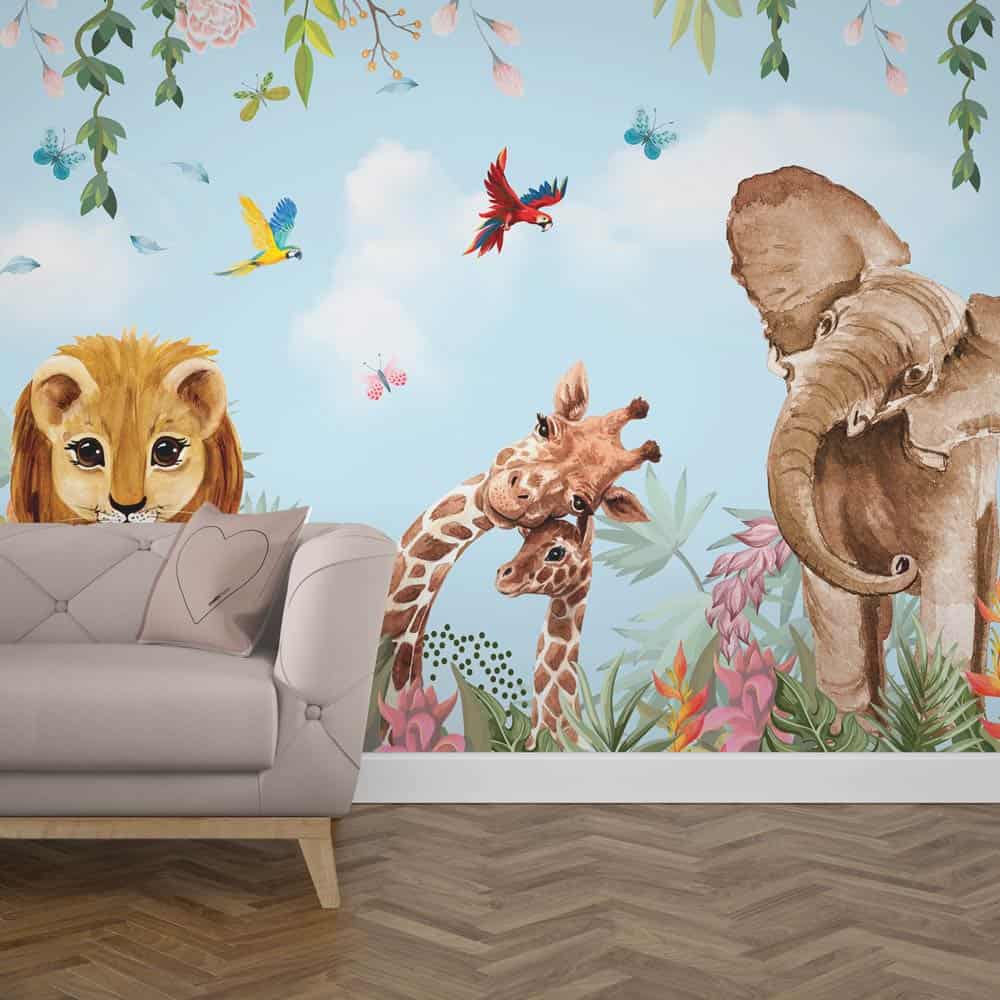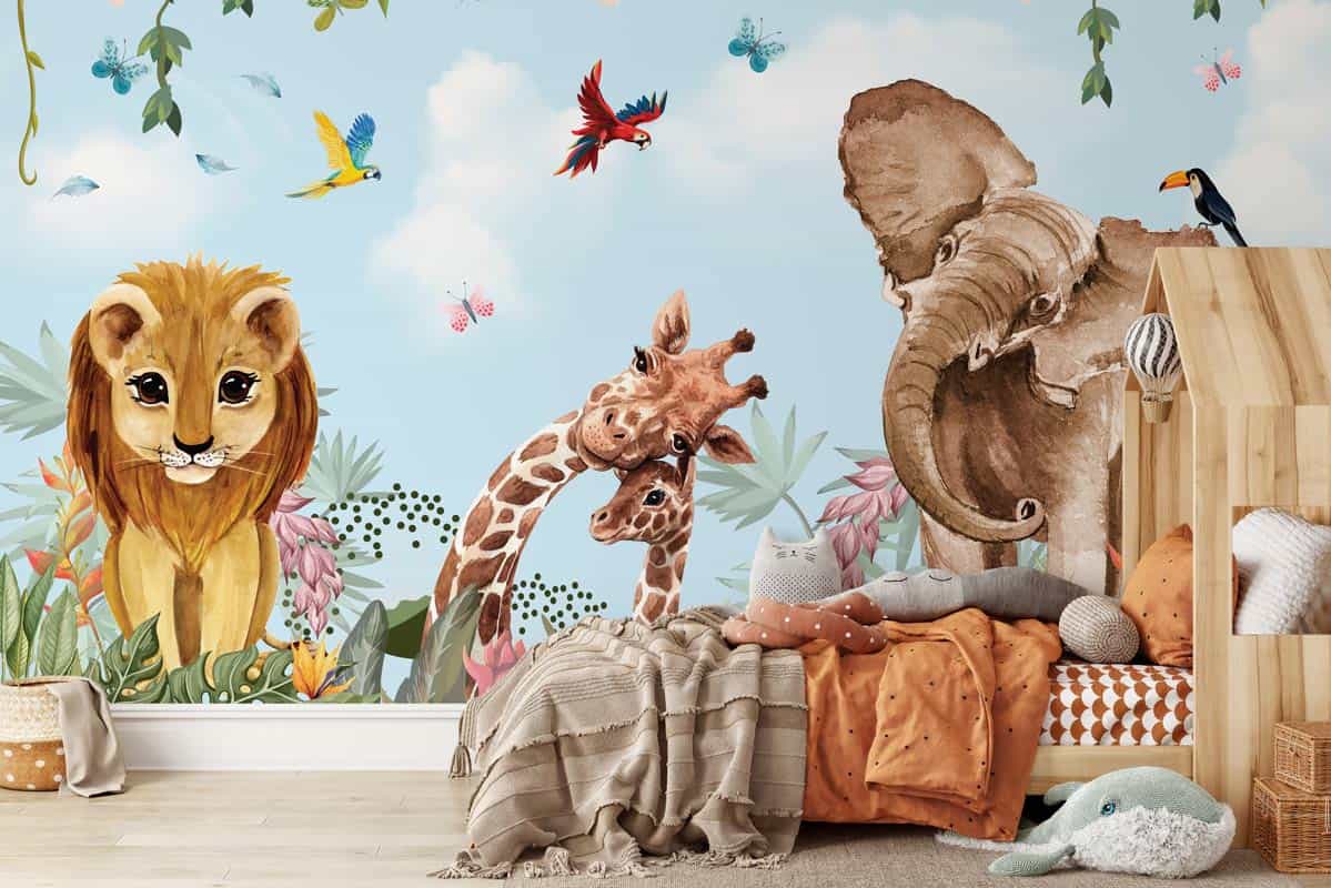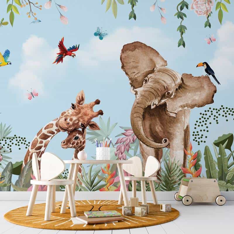 Transformă camera prichindelului tău într-un loc magic, unde poveștile devin realitate. Tapet Elephant Jungle - Model cu animale din safari: elefant, leu, girafă, papagali. Ușor de Aplicat. Decor inedit. Rezistent la umezeală. Culori Vibrante.