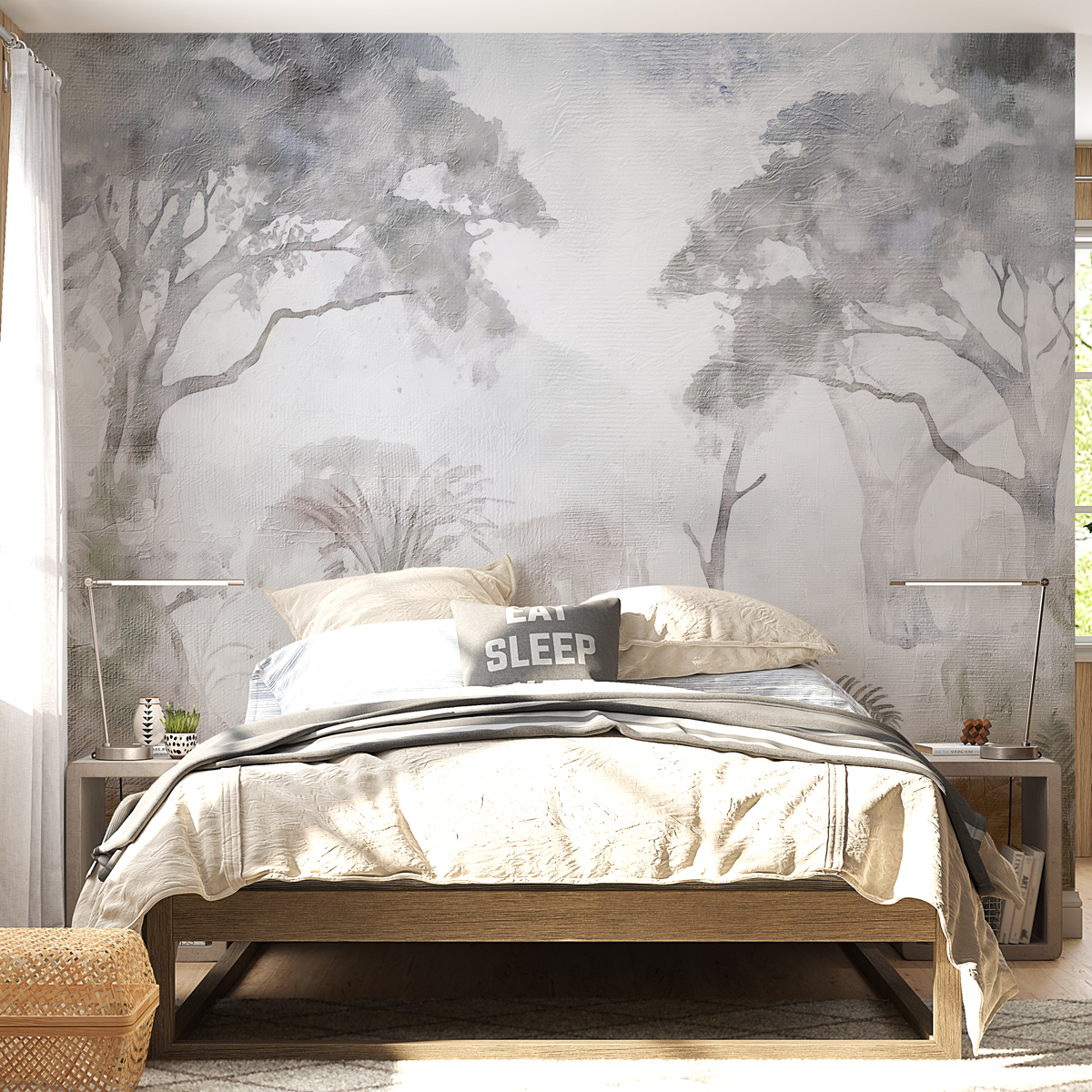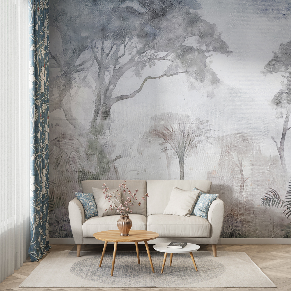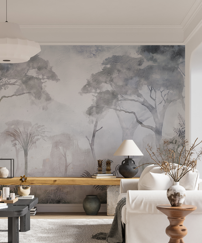 Transformă-ți spațiul cu tapetul Falling Mist, un design delicat de copaci pictați în acuarelă, în nuanțe soft de gri, pe o subtilă textură canvas. Efectul său eteric și liniștit conferă profunzime și calm oricărui interior, fiind ideal pentru livinguri moderne, dormitoare elegante, birouri sau spații HoReCa. Perfect pentru cei care caută un tapet premium cu copaci acuarelă, decor de perete subtil și sofisticat sau design interior relaxant.
