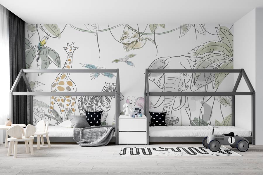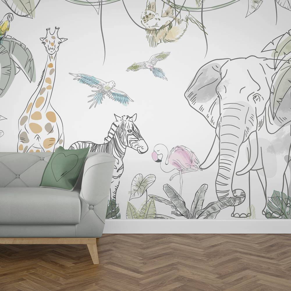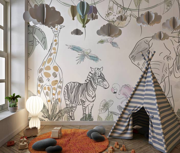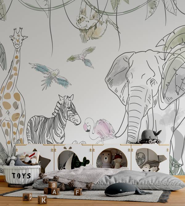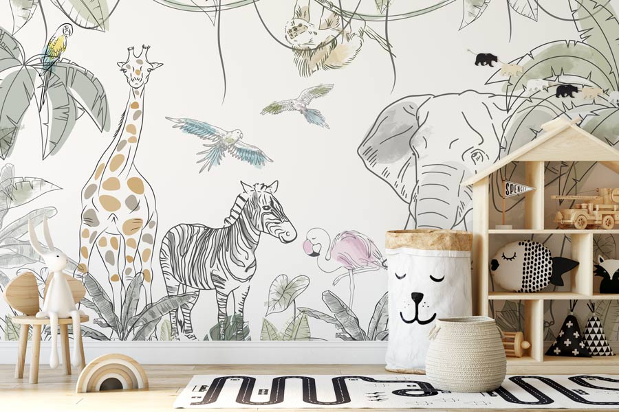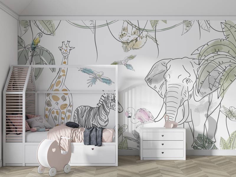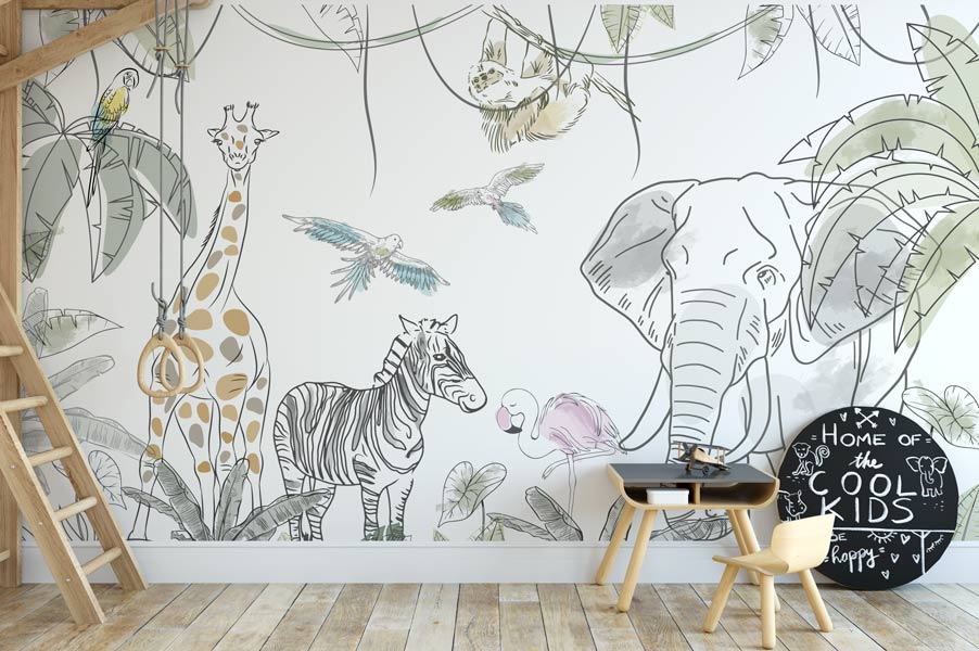 Suflă puțin praf de stele în camera copilului tau și pășește alături de el în lumea pădurilor tropicale. Tapetul Sketch Jungle realizat ca o schiță grafică, cu animăluțe din savană (girafă, elefant, flamingo, papagali, zebră) creează perfect o atmosferă caldă in camera copiilor. Pentru camera copiilor. Ușor de Aplicat. Decor inedit. Rezistente la umezeală. Culori Vibrante.