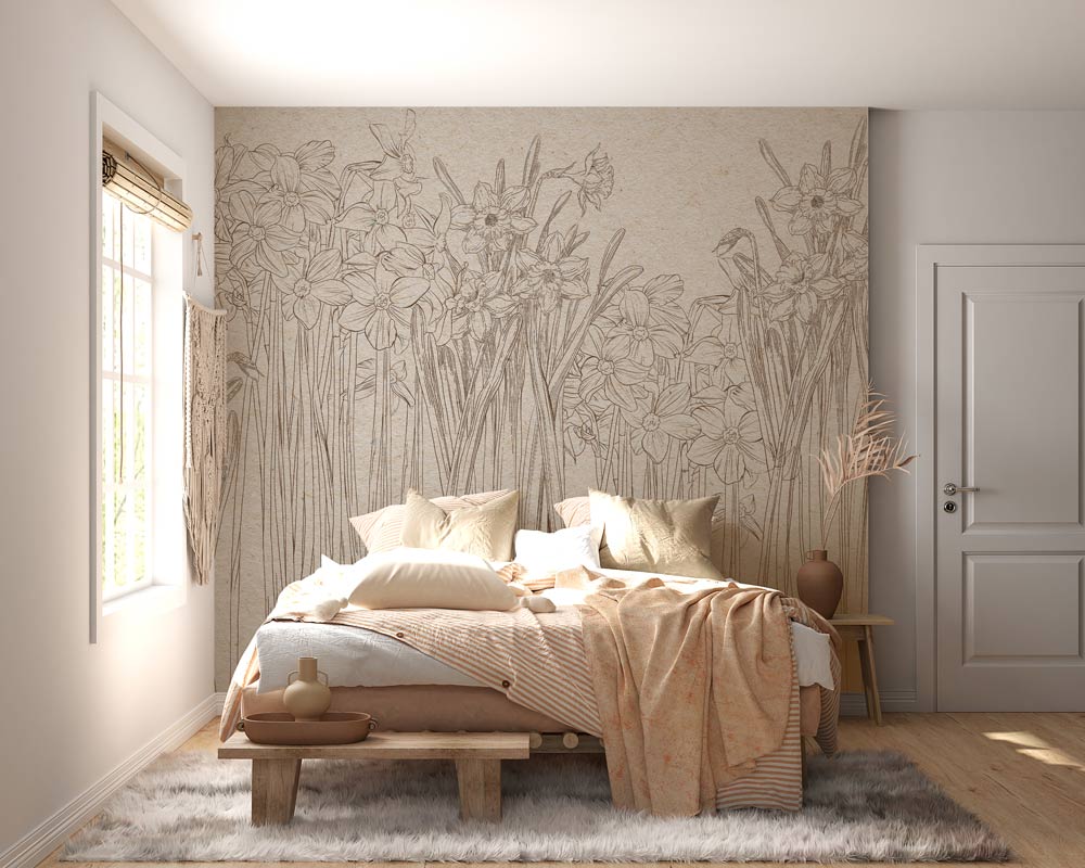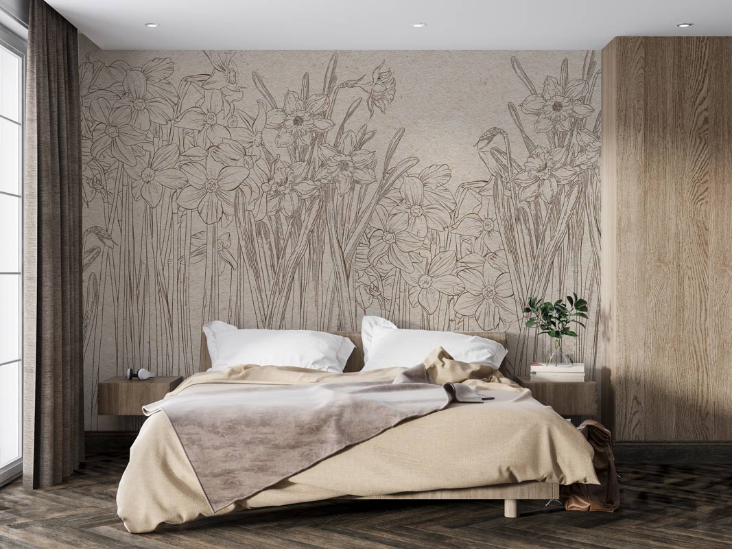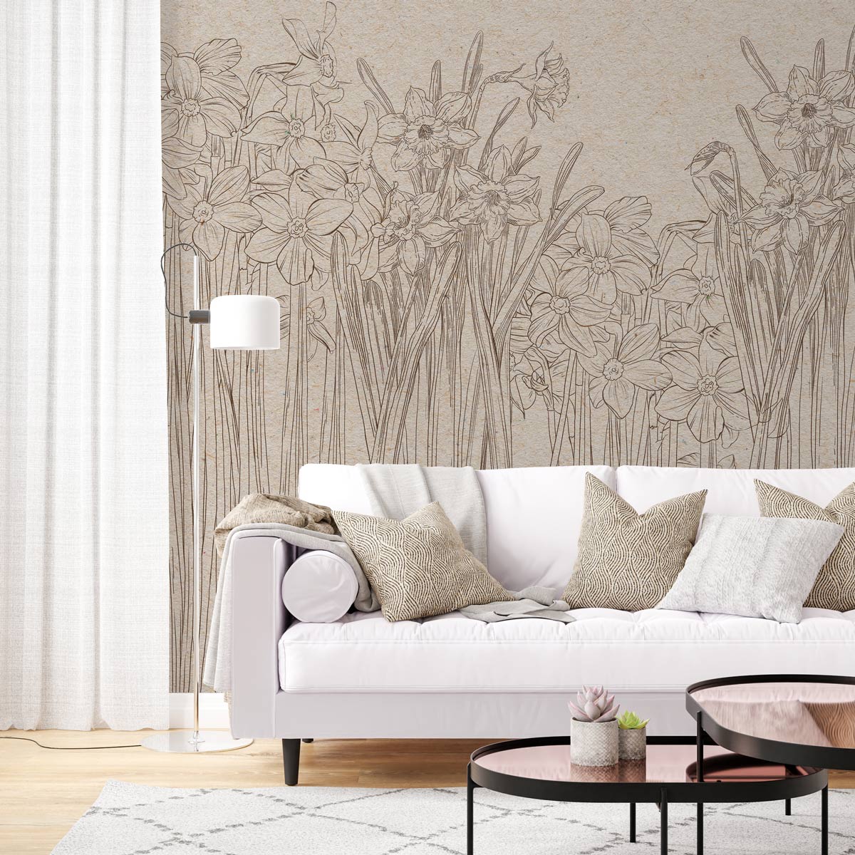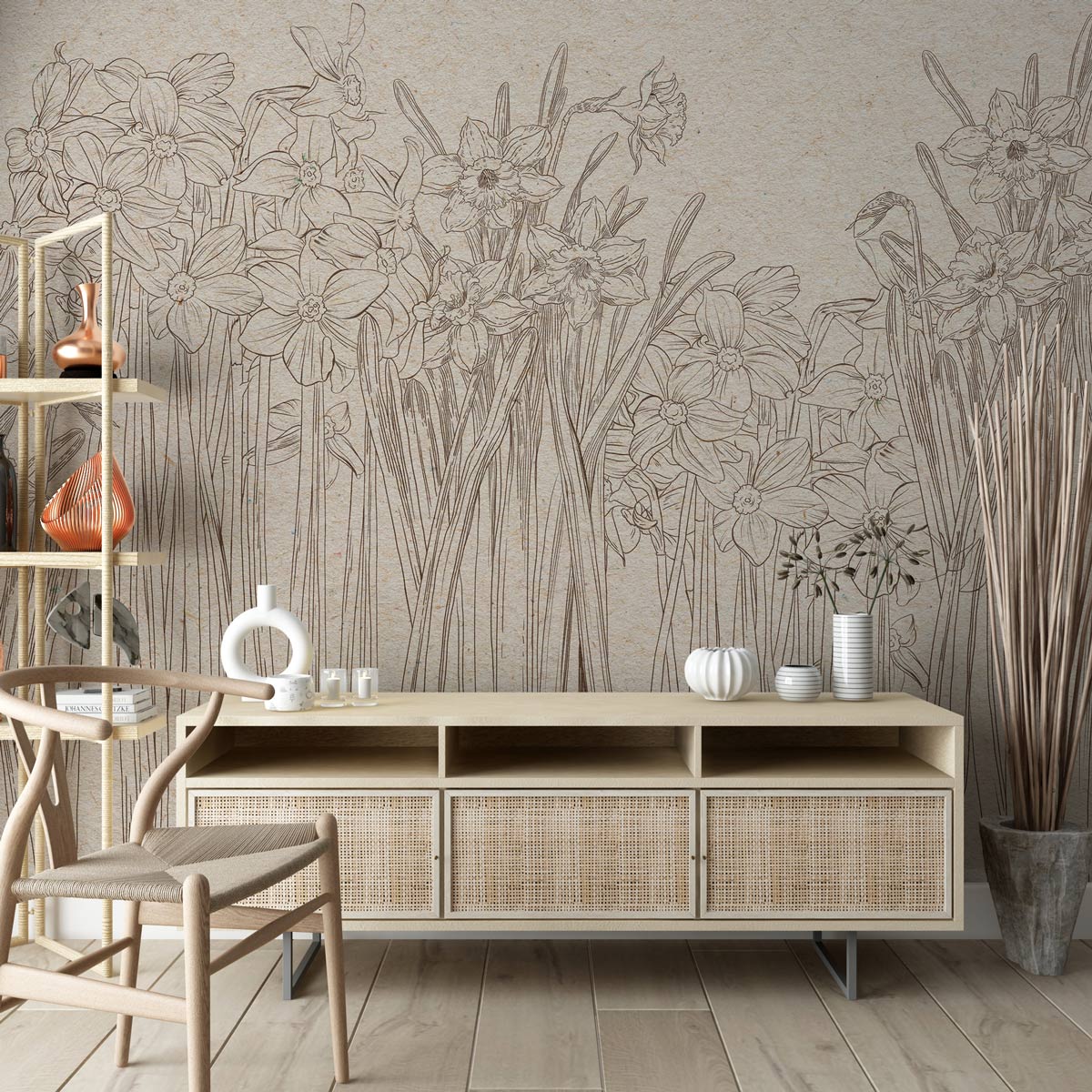 Îmbracă-ți pereții cu delicatețea primăverii prin "Sketches of Spring", un tapet premium ce surprinde frumusețea narciselor schițate manual pe un fundal bej, cu aspect de hârtie naturală.
