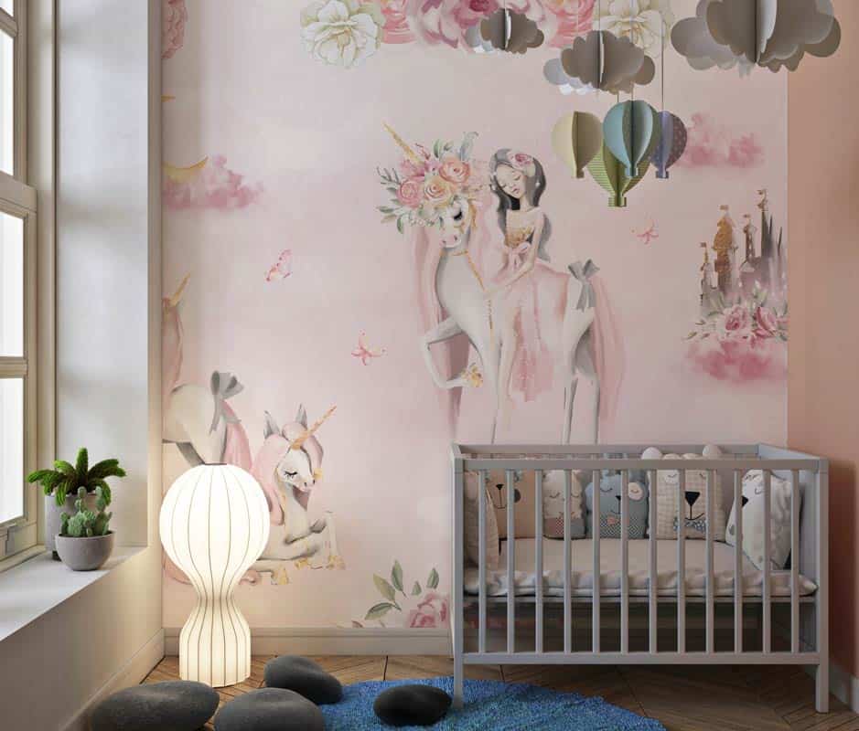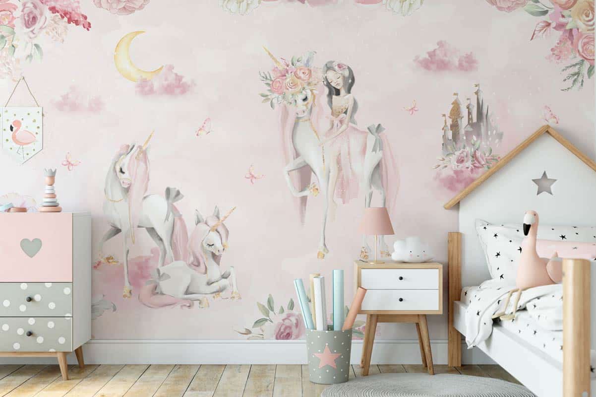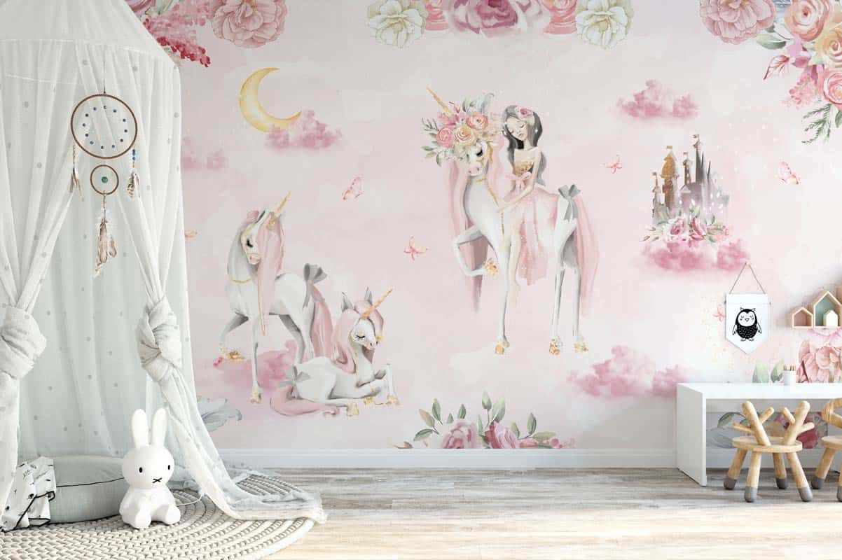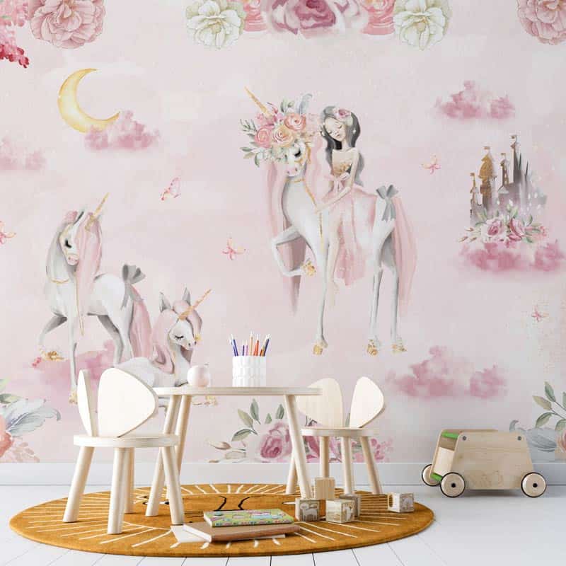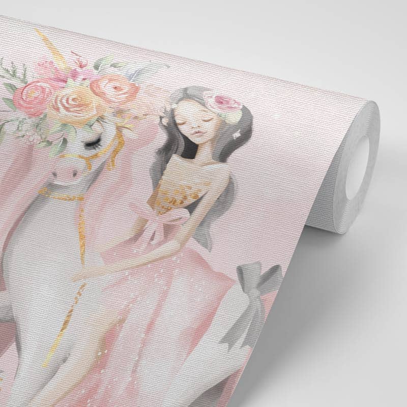 Transformă camera prichindelului tău într-un loc magic, unde poveștile devin realitate. Tapet The Magic World of Unicorns - Model cu unicorni și prințese pentru fetițe cochete. Ușor de Aplicat. Decor inedit. Rezistent la umezeală. Culori Vibrante.