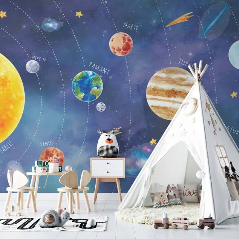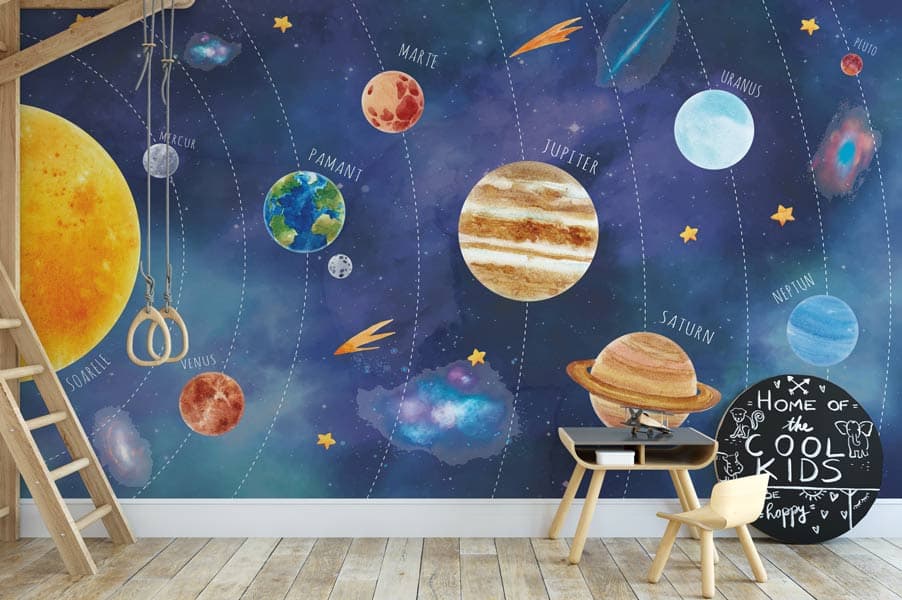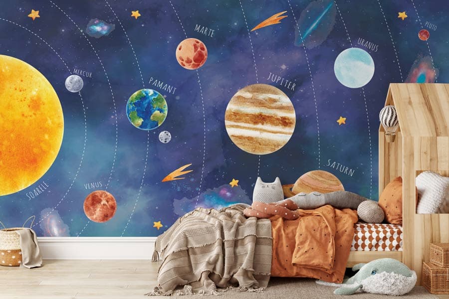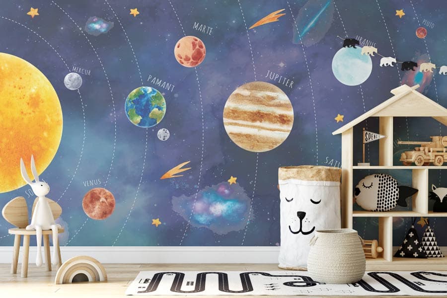 Transformă camera copilului tău într-un loc de vis, unde poveștile devin realitate. Micul tău explorator va fi fascinat să descopere Sistemul Solar. Culorile tapetului Solar System sunt vii și par picatate în tușă de acuarelă, perfecte pentru camera unui copil plin de curiozitate. Pentru bebeluși, fetițe sau băieți. Ușor de Aplicat. Decor inedit. Rezistente la umezeală. Culori Vibrante.
