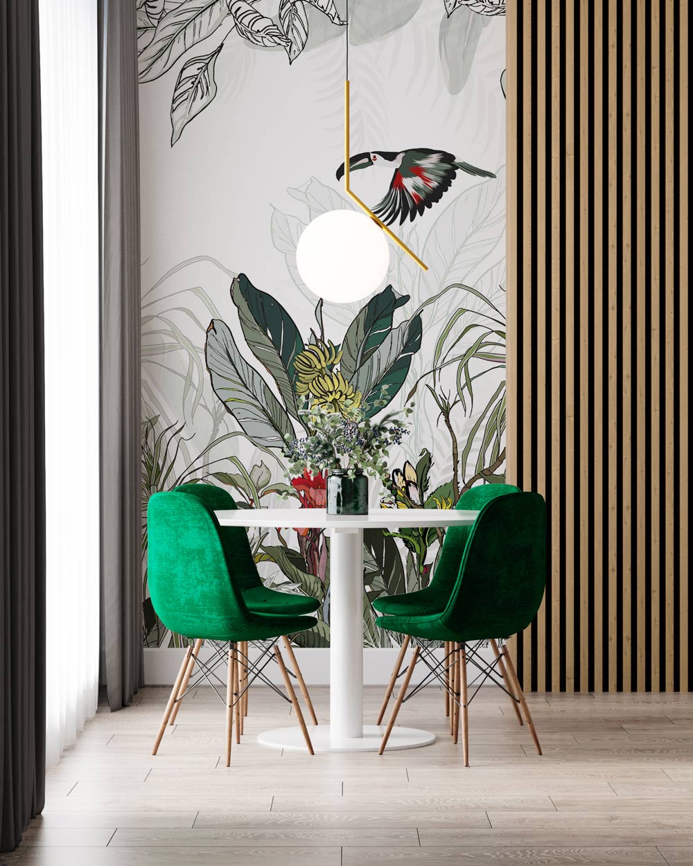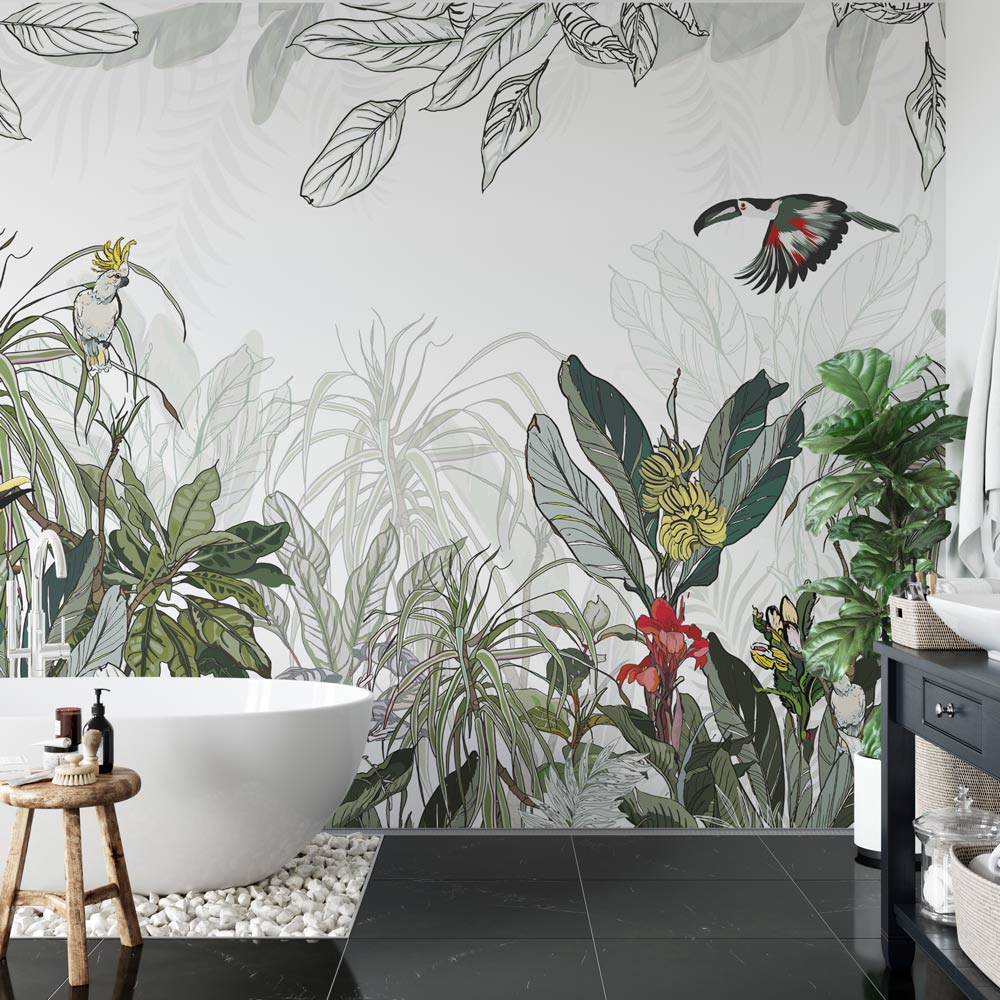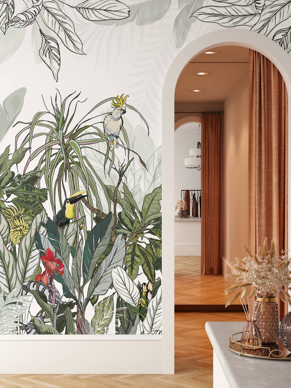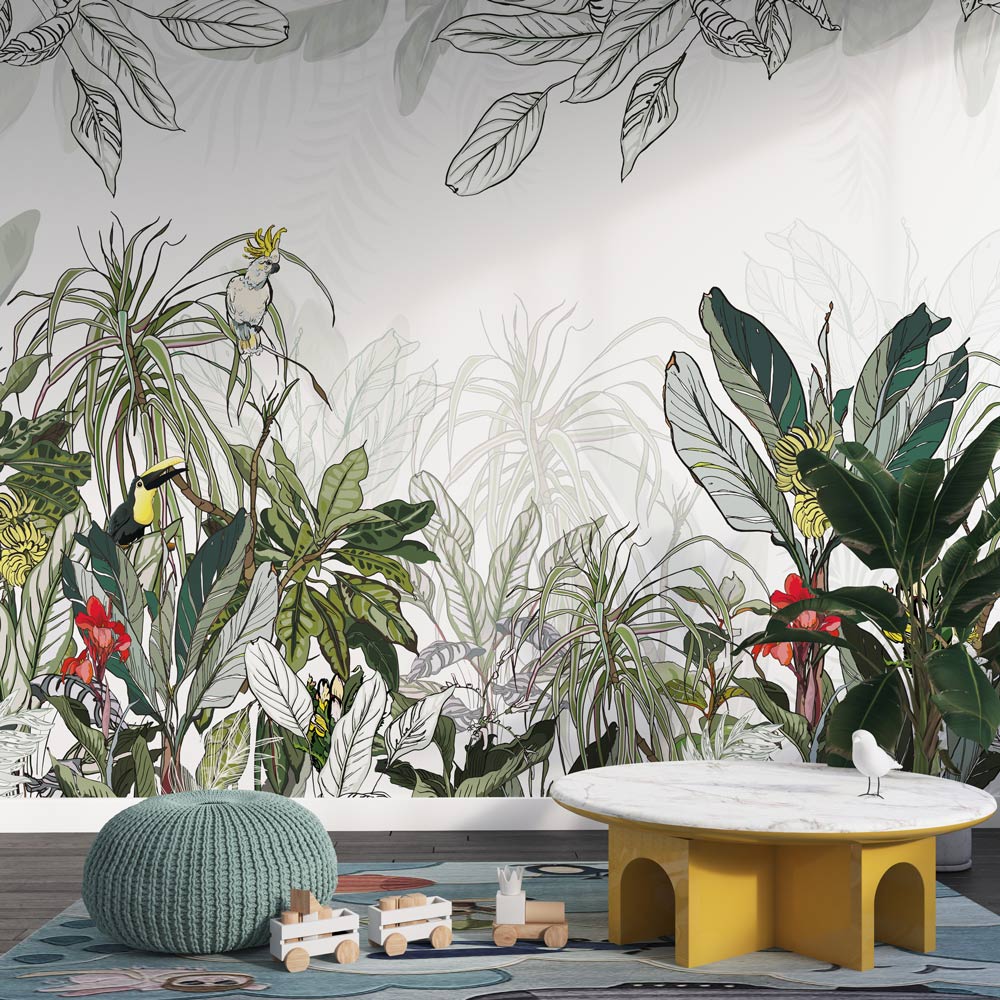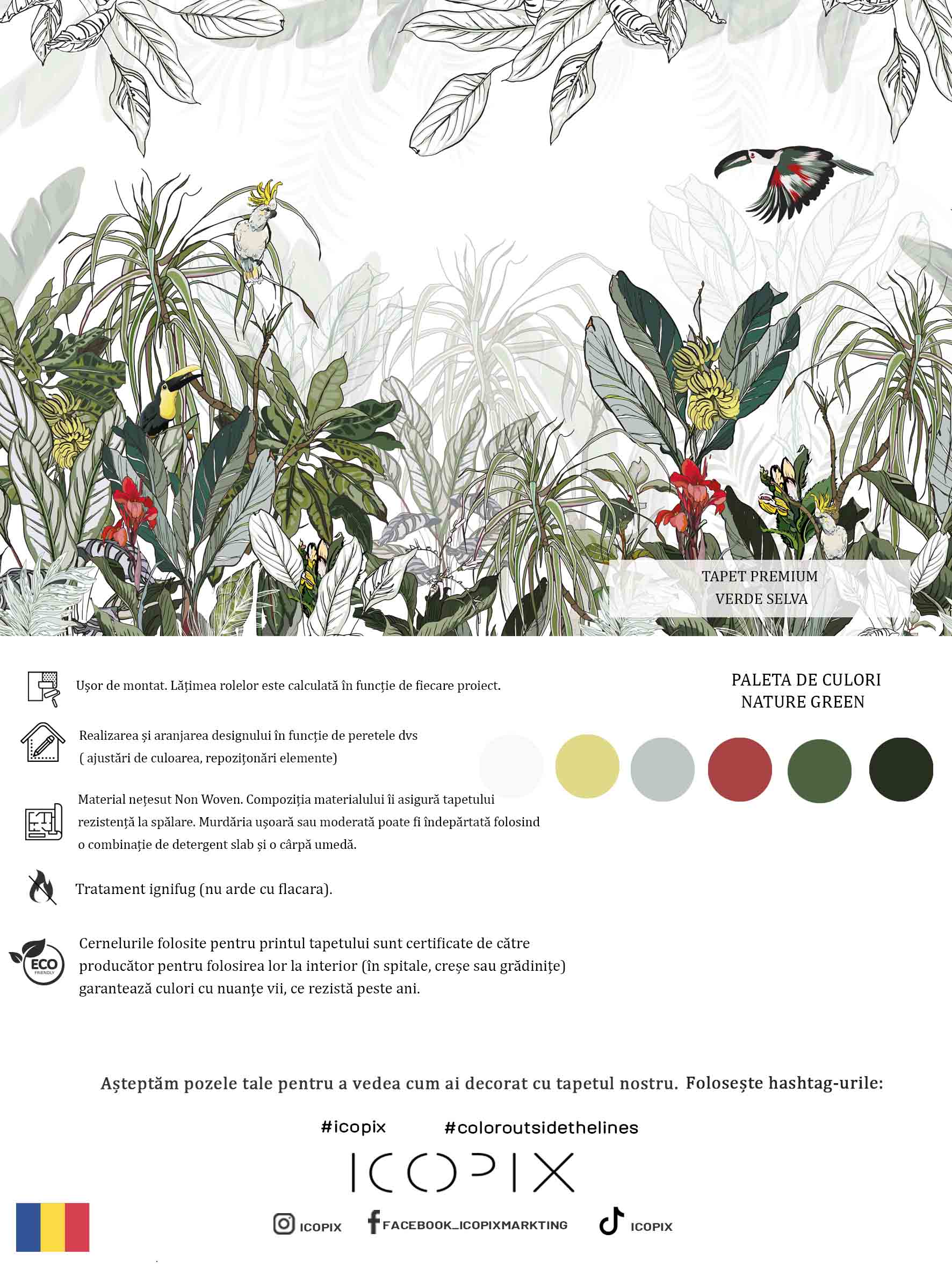 Decorează-ți pereții și adu la tine acasă un decor unic tropical - Tapet Verde Selva, un tapet vibrant care aduce esența junglei tropicale direct în inima casei tale, printr-un design exuberant cu frunze verzi și papagali tucano colorați. Ai transport gratuit la comenzile mai mari de 500 RON. Alege tapetul din oferta Icopix, cu un model unic. Ușor de aplicat. Decor inedit.